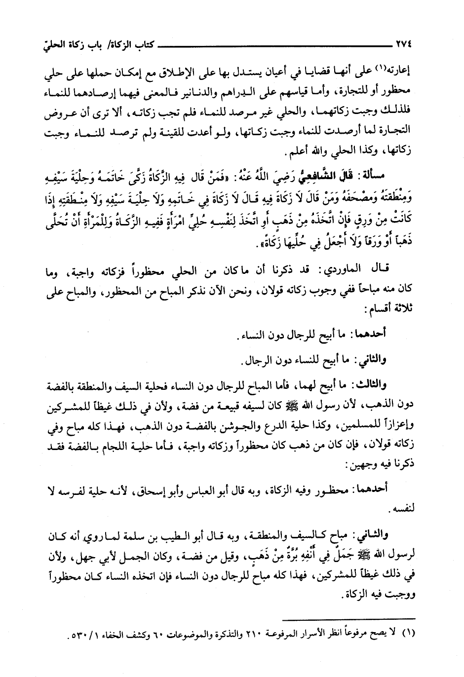 قَالَ الْمَاوَرْدِيُّ: قَدْ ذَكَرْنَا أَنَّ مَا كَانَ مِنَ الْحُلِيِّ مَحْظُورًا فَزَكَاتُهُ وَاجِبَةٌ، وَمَا كَانَ مِنْهُ مُبَاحًا فَفِي وُجُوبِ زَكَاتِهِ قَوْلَانِ، وَنَحْنُ الآن نذكر الْمُبَاحَ مِنَ الْمَحْظُورِ، وَالْمُبَاحُ عَلَى ثَلَاثَةِ أَقْسَامٍ:
