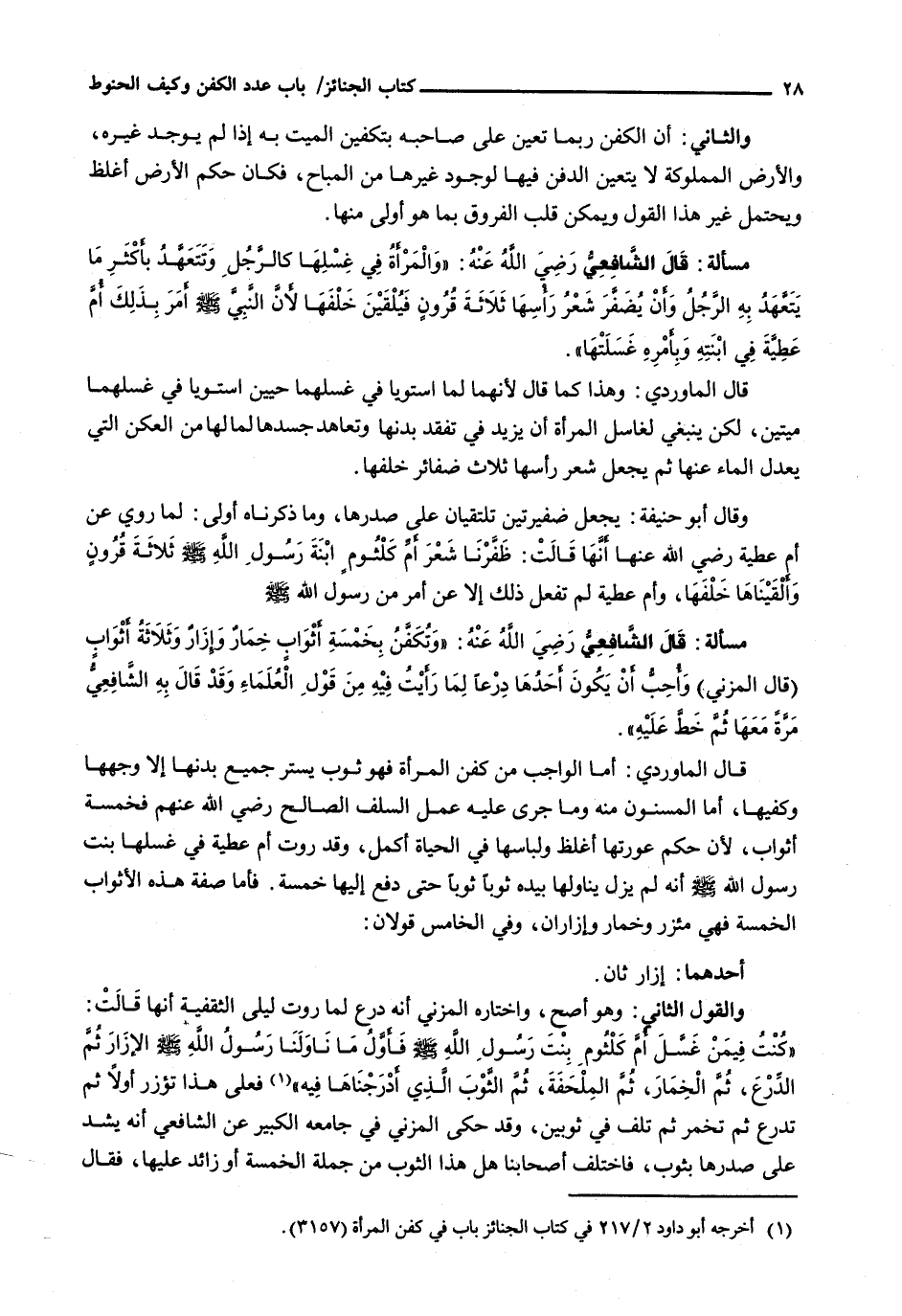 قال الشافعي رضي الله عنه: " وَتُكَفَّنُ بِخَمْسَةِ أَثْوَابٍ خمارٌ وإزارٌ وَثَلَاثَةُ أَثْوَابٍ (قَالَ الْمُزَنِيُّ) وَأُحِبُّ أَنْ يَكُونَ أَحَدُهَا دِرْعًا لِمَا رَأَيْتُ فِيهِ مِنَ قَوْلِ الْعُلَمَاءِ وَقَدْ قَالَ بِهِ الشَّافِعِيُّ مَرَّةً مَعَهَا ثُمَّ خَطَّ عَلَيْهِ ".