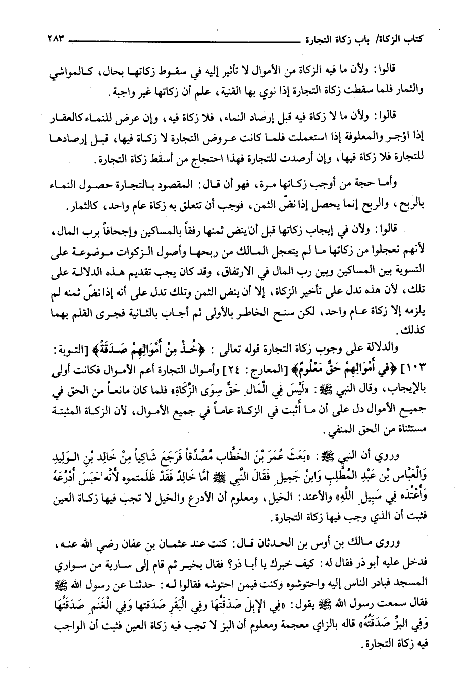 والدلالة على وجوب زكاة التجارة قَوْله تَعَالَى: {خُذْ مِنْ أمْوَالِهِمْ صَدَقَةً) {التوبة: 103) {فِي أمْوَالِهِمْ حَقٌّ مَعْلُومٌ) {المعارج: 24) وَأَمْوَالُ التِّجَارَةِ أعم الأموال فكانت أولى بالإيجاب، وقال النبي - صَلَّى اللَّهُ عَلَيْهِ وَسَلَّم َ -: " لَيْسَ فِي الْمَالِ حَقٌّ سِوَى الزَّكَاةِ " فَلَمَّا كَانَ مَانِعًا مِنَ الْحَقِّ فِي جَمِيعِ الْأَمْوَالِ دل على أن ما أثبت في الزكاة عاماً فِي جَمِيعِ الْأَمْوَالِ، لِأَنَّ الزَّكَاةَ الْمُثْبَتَةَ مُسْتَثْنَاةٌ مِنَ الْحَقِّ الْمَنْفِيِّ.