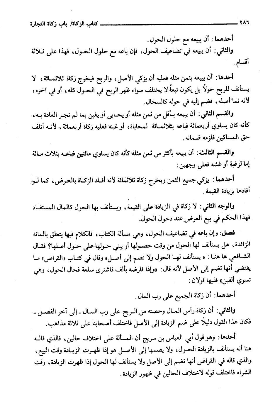 وَالثَّانِي: أَنَّ زَكَاةَ رَأْسِ الماس وَحِصَّتَهُ مِنَ الرِّبْحِ عَلَى رَبِّ الْمَالِ - إِلَى آخِرِ الْفَصْلِ - فَكَانَ هَذَا الْقَوْلُ دَلِيلًا عَلَى ضَمِّ الزِّيَادَةِ إِلَى الْأَصْلِ فَاخْتَلَفَ أَصْحَابُنَا عَلَى ثَلَاثَةِ مَذَاهِبَ.
