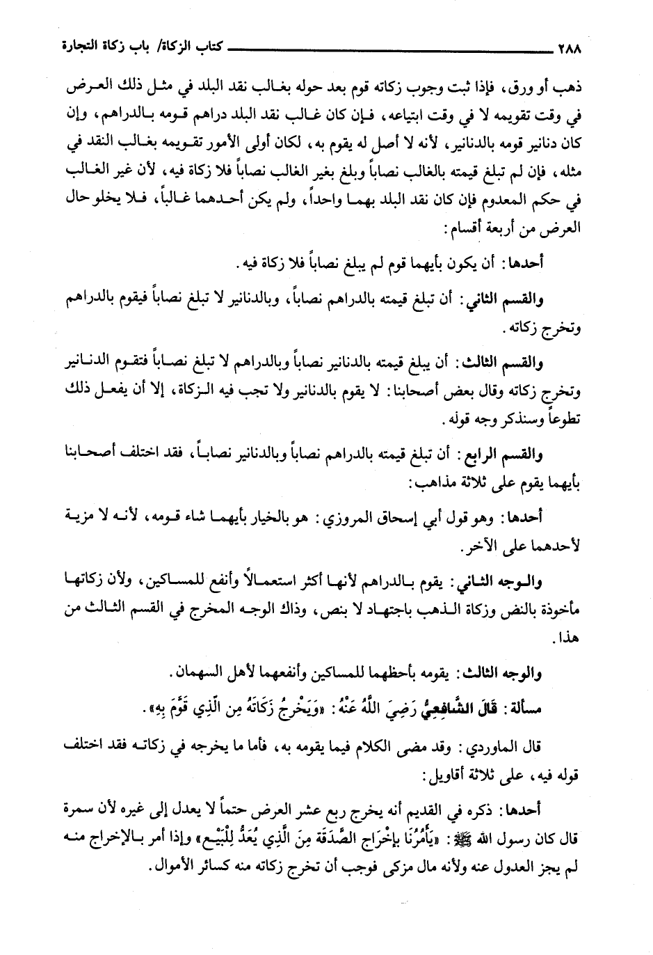 ذَهَبٍ أَوْ وَرَقٍ، فَإِذَا ثَبَتَ وُجُوبُ زَكَاتِهِ قُوِّمَ بَعْدَ حَوْلِهِ بِغَالِبِ نَقْدِ الْبَلَدِ فِي مِثْلِ ذَلِكَ الْعَرَضِ فِي وَقْتِ تَقْوِيمِهِ لَا فِي وَقْتِ ابْتِيَاعِهِ، فَإِنْ كَانَ غَالِبُ نَقْدِ الْبَلَدِ دَرَاهِمَ قَوَّمَهُ بِالدَّرَاهِمِ، وَإِنْ كَانَ دَنَانِيرَ قَوَّمَهُ بِالدَّنَانِيرِ، لِأَنَّهُ لَا أَصْلَ لَهُ يَقُومُ به، لكان أَوْلَى الْأُمُورِ تَقْوِيمَهُ بِغَالِبِ النَّقْدِ فِي مِثْلِهِ، فَإِنْ لَمْ تَبْلُغْ قِيمَتُهُ بِالْغَالِبِ نِصَابًا وَبَلَغَ بِغَيْرِ الْغَالِبِ نِصَابًا فَلَا زَكَاةَ فِيهِ، لِأَنَّ غَيْرَ الْغَالِبِ فِي حُكْمِ الْمَعْدُومِ فَإِنْ كَانَ نَقْدُ الْبَلَدِ بِهِمَا وَاحِدًا، وَلَمْ يَكُنْ أَحَدُهُمَا غَالِبًا، فَلَا يَخْلُو حَالُ الْعَرَضِ مِنْ أَرْبَعَةِ أَقْسَامٍ: