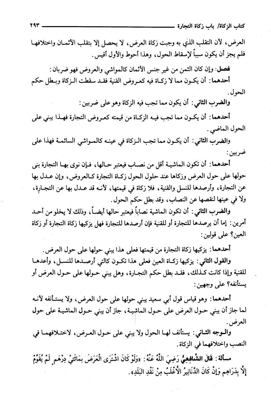 العرض، لأن التقلب الَّذِي بِهِ وَجَبَتْ زَكَاةُ الْعَرَضِ، لَا يَحْصُلُ إلا بتقلب الْأَثْمَانِ وَاخْتِلَافِهَا فَلَمْ يَجُزْ أَنْ يَكُونَ سَبَبًا لِإِسْقَاطِ الْحَوْلِ، وَهَذَا أَحْوَطُ وَالْأَوَّلُ أَقْيَسُ.