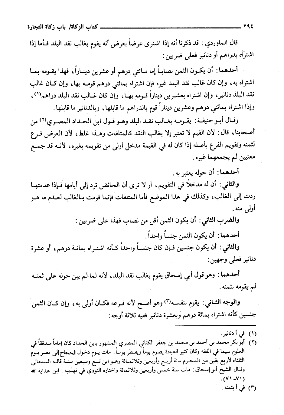 أَحَدُهُمَا: أَنْ يَكُونَ الثَّمَنُ نِصَابًا إِمَّا مِائَتَيْ دِرْهَمٍ أَوْ عِشْرِينَ دِينَارًا، فَهَذَا يُقَوِّمُهُ بِمَا اشْتَرَاهُ بِهِ، وَإِنْ كَانَ غَالِبُ نَقْدِ الْبَلَدِ غَيْرَهُ فَإِنِ اشْتَرَاهُ بِمِائَتَيْ دِرْهَمٍ قَوَّمَهُ بِهَا، وَإِنْ كَانَ غَالِبُ نَقْدِ الْبَلَدِ دَنَانِيرَ، وَإِنِ اشْتَرَاهُ بِعِشْرِينَ دِينَارًا قَوَمَّهُ بِهَا، وَإِنْ كَانَ غَالِبُ نَقْدِ الْبَلَدِ دَرَاهِمَ، وَإِذَا اشْتَرَاهُ بِمِائَتَيْ دِرْهَمٍ وَعِشْرِينَ دِينَارًا قَوَّمَ بِالدَّرَاهِمِ مَا قَابَلَهَا، وَبِالدَّنَانِيرِ مَا قَابَلَهَا.
