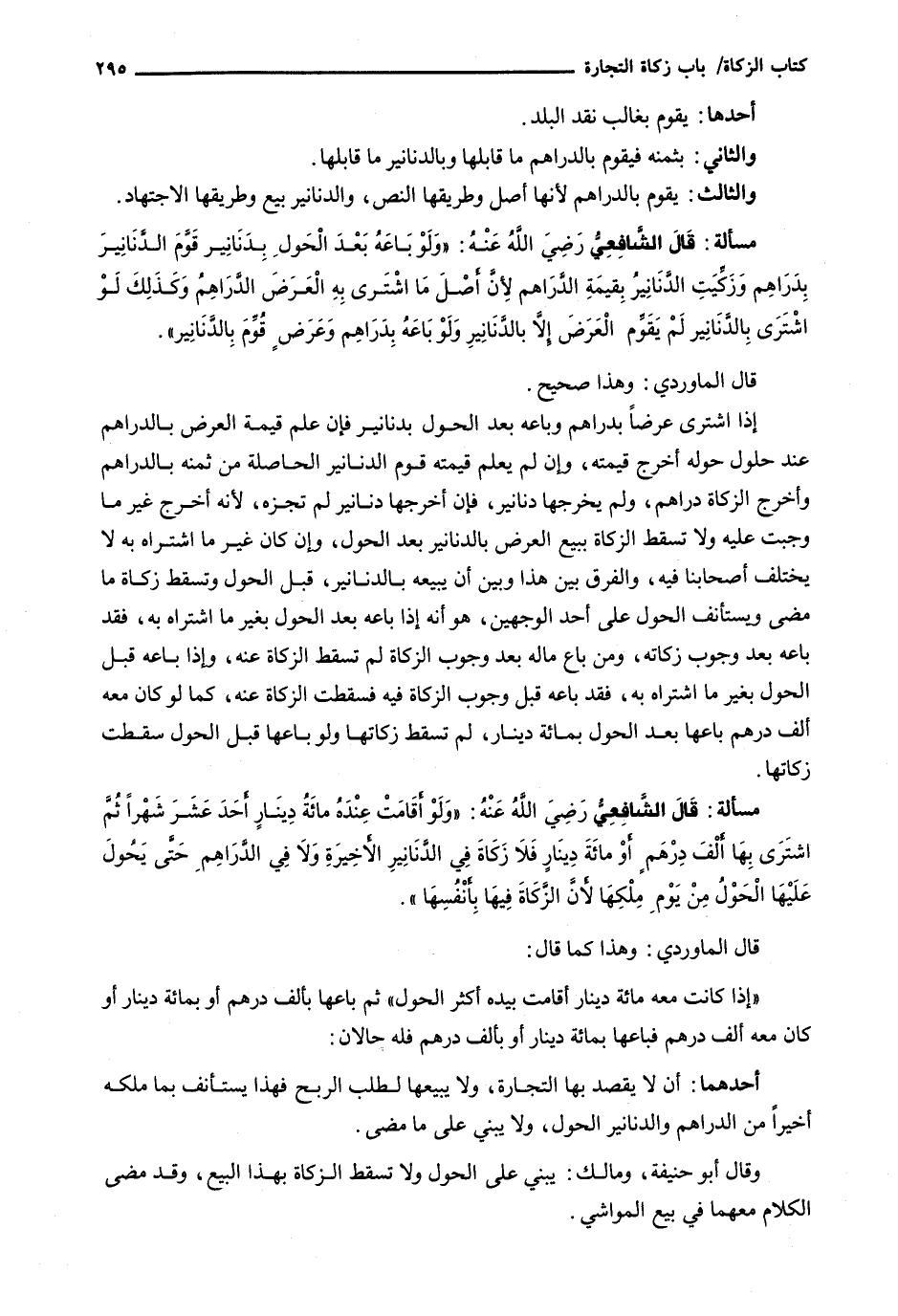 قَالَ الْمَاوَرْدِيُّ: وَهَذَا كَمَا قَالَ: " إِذَا كَانَتْ مَعَهُ مِائَةُ دِينَارٍ أَقَامَتْ بِيَدِهِ أَكْثَرَ الْحَوْلِ " ثُمَّ بَاعَهَا بِأَلْفِ دِرْهَمٍ أَوْ بِمِائَةِ دِينَارٍ أَوْ كَانَ مَعَهُ أَلْفُ دِرْهَمٍ فَبَاعَهَا بِمِائَةِ دِينَارٍ أَوْ بِأَلْفِ دِرْهَمٍ فَلَهُ حَالَانِ: