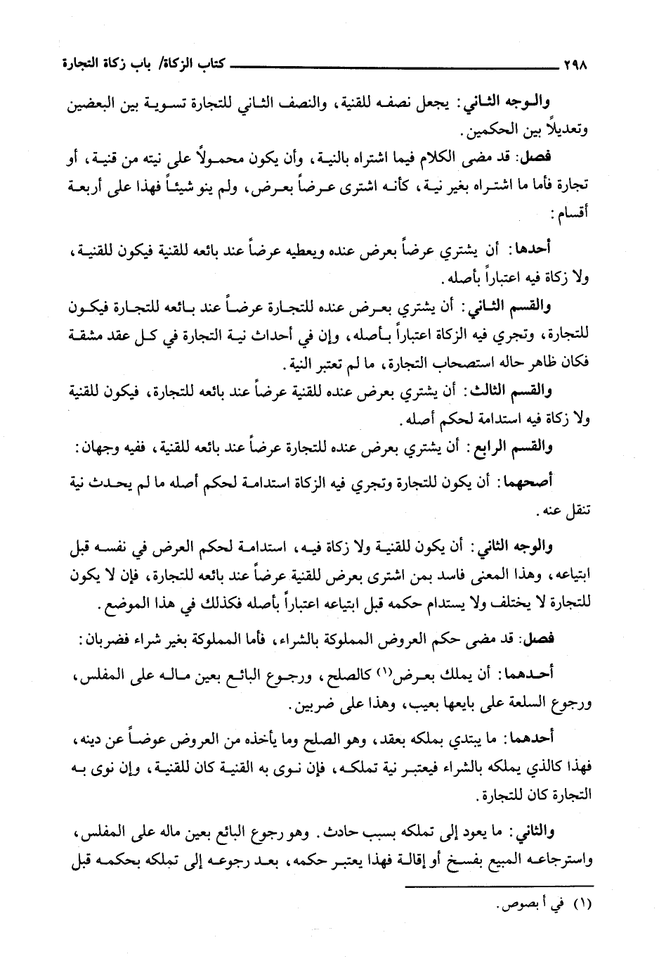 : قَدْ مَضَى الْكَلَامُ فِيمَا اشْتَرَاهُ بِالنِّيَّةِ، وأن يَكُونُ مَحْمُولًا عَلَى نِيَّتِهِ مِنْ قِنْيَةٍ، أَوْ تِجَارَةٍ فَأَمَّا مَا اشْتَرَاهُ بِغَيْرِ نِيَّةٍ، كَأَنَّهُ اشْتَرَى عَرَضًا بِعَرَضٍ، وَلَمْ يَنْوِ شَيْئًا فَهَذَا عَلَى أَرْبَعَةِ أَقْسَامٍ: