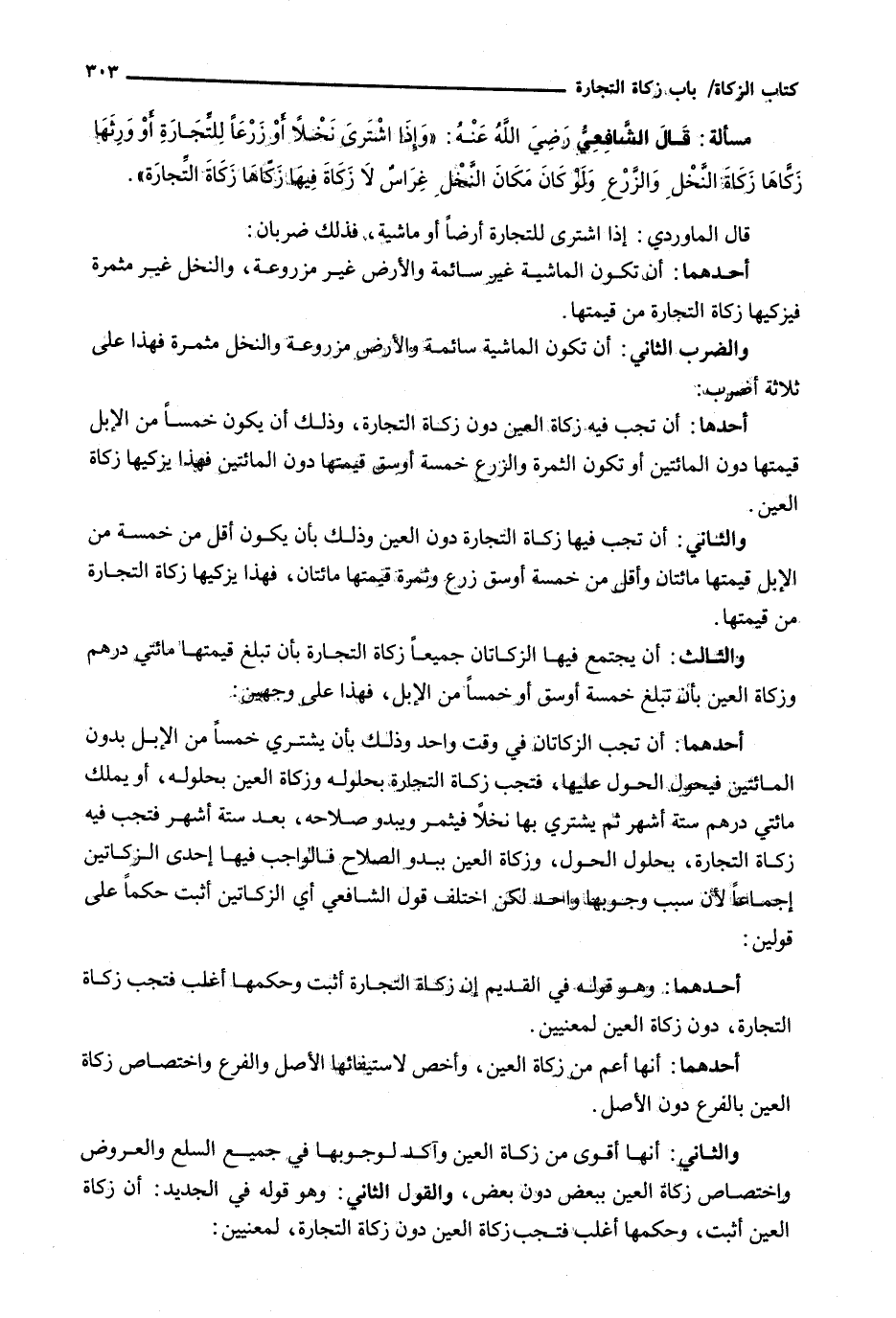 وَالثَّانِي: أَنْ تَجِبَ فِيهَا زَكَاةُ التِّجَارَةِ دُونَ الْعَيْنِ وذلك بأن يكون أقل من خمسة مِنَ الْإِبِلِ قِيمَتُهَا مِائَتَانِ وَأَقَلَّ مِنْ خَمْسَةِ أَوْسُقِ زَرْعٍ وَثَمَرَةٍ قِيمَتُهَا مِائَتَانِ، فَهَذَا يُزَكِّيهَا زَكَاةَ التِّجَارَةِ مِنْ قِيمَتِهَا.
