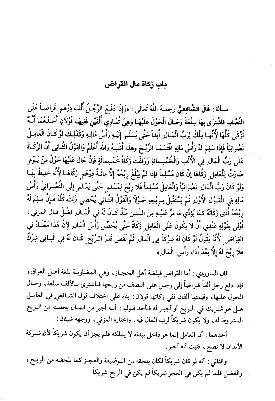 قَالَ الْمَاوَرْدِيُّ: أَمَّا الْقِرَاضُ فَبِلُغَةِ أَهْلِ الْحِجَازِ، وَهِيَ الْمُضَارَبَةُ بِلُغَةِ أَهْلِ الْعِرَاقِ، فَإِذَا دَفَعَ رَجُلٌ أَلْفًا قِرَاضًا إِلَى رَجُلٍ عَلَى النِّصْفِ مِنْ رِبْحِهَا فَاشْتَرَى بِالْأَلْفِ سِلْعَةً، وَحَالَ الْحَوْلُ عليها، وقيمتها ألفان ففي زكاتها قولان: بناه على اختلاف قول الشَّافِعِيِّ فِي الْعَامِلِ هَلْ هُوَ شَرِيكٌ فِي الرِّبْحِ أَوْ أَجِيرٌ لَهُ فَأَحَدُ قَوْلَيْهِ: إِنَّهُ أَجِيرٌ مِنَ الْمَالِ بِحِصَّتِهِ مِنَ الرِّبْحِ الْمَشْرُوطِ لَهُ، وَلَا يَكُونُ شَرِيكًا لِرَبِّ الْمَالِ فِيهِ، وَاخْتَارَهُ الْمُزَنِيُّ، وَوَجْهُهُ شَيْئَانِ: