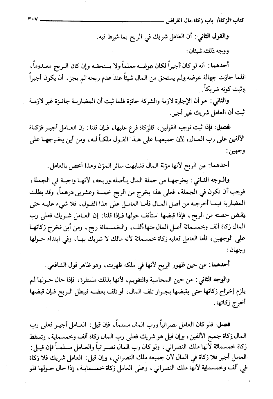 : فَلَوْ كَانَ الْعَامِلُ نَصْرَانِيًّا وَرَبُّ الْمَالِ مُسْلِمًا، فَإِنْ قِيلَ: الْعَامِلُ أَجِيرٌ فَعَلَى رَبِّ الْمَالِ زَكَاةُ جَمِيعِ الْأَلْفَيْنِ، وَإِنْ قِيلَ هُوَ شَرِيكٌ فَعَلَى رَبِّ المال زكاة ألف وخمسماية، وَتَسْقُطُ زَكَاةُ خَمْسِمِائَةٍ لِأَنَّهَا مِلْكُ النَّصْرَانِيِّ، وَلَوْ كَانَ رَبُّ الْمَالِ نَصْرَانِيًّا وَالْعَامِلُ مُسْلِمًا فَإِنْ قِيلَ: الْعَامِلُ أَجِيرٌ فَلَا زَكَاةَ فِي الْمَالِ لِأَنَّ جَمِيعَهُ مِلْكُ النَّصْرَانِيِّ، وَإِنْ قِيلَ: الْعَامِلُ شريك فلا زكاة في ألف وخمسماية لأنها ملك النصراني، وعلى العامل زكاة خمسماية، إِذَا حَالَ حَوْلُهَا فَلَوْ