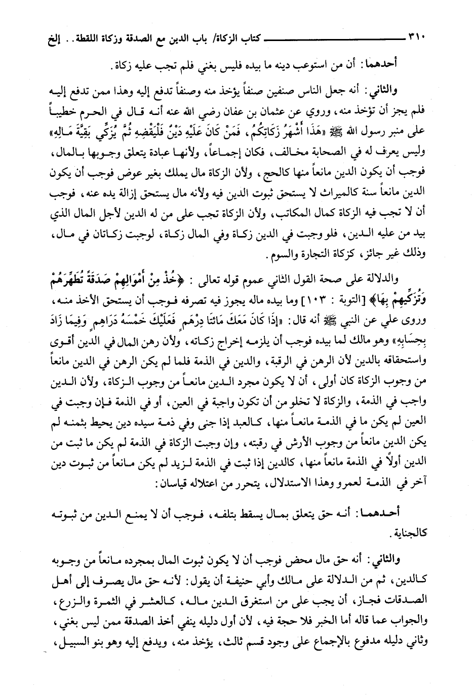 وَالثَّانِي: أَنَّهُ جَعَلَ النَّاسَ صِنْفَيْنِ صِنْفًا يُؤْخَذُ مِنْهُ وَصِنْفًا تُدْفَعُ إِلَيْهِ وَهَذَا مِمَّنْ تُدْفَعُ إِلَيْهِ فَلَمْ يَجُزْ أَنْ تُؤْخَذَ مِنْهُ، وَرُوِيَ عَنْ عُثْمَانَ بْنِ عَفَّانَ رَضِيَ اللَّهُ عَنْهُ أَنَّهُ قال في الحرم خَطِيبًا عَلَى مِنْبَرِ رَسُولِ اللَّهِ - صَلَّى اللَّهُ عَلَيْهِ وَسَلَّم َ - " هذا أشهر زَكَاتِكُمُ، فَمَنْ كَانَ عَلَيْهِ دَيْنٌ فَلْيَقْضِهِ ثُمَّ يزكي بقية ماله ".