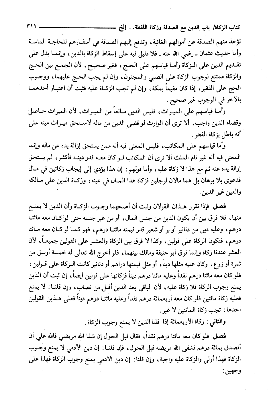 تُؤْخَذُ مِنْهُمُ الصَّدَقَةُ عَنْ أَمْوَالِهِمُ الْغَائِبَةِ، وَتُدْفَعُ إِلَيْهِمُ الصَّدَقَةُ فِي أَسْفَارِهِمْ لِلْحَاجَةِ الْمَاسَّةِ وَأَمَّا حَدِيثُ عُثْمَانَ - رَضِيَ اللَّهُ عَنْهُ - فَلَا دَلِيلَ فِيهِ عَلَى إِسْقَاطِ الزَّكَاةِ بِالدَّيْنِ، وَإِنَّمَا يَدُلُّ عَلَى تَقْدِيمِ الدَّيْنِ عَلَى الزَّكَاةِ وَأَمَّا قِيَاسُهُمْ عَلَى الْحَجِّ، فَغَيْرُ صَحِيحٍ، لِأَنَّ الْجَمْعَ بَيْنَ الْحَجِّ وَالزَّكَاةَ مُمْتَنِعٌ لِوُجُوبِ الزَّكَاةِ عَلَى الصَّبِيِّ والمجنون، وإن لم يجب الحج عليها، وَوُجُوبُ الْحَجِّ عَلَى الْفَقِيرِ، إِذَا كَانَ مُقِيمًا بِمَكَّةَ، وَإِنْ لَمْ تَجِبِ الزَّكَاةُ عَلَيْهِ فَثَبَتَ أَنَّ اعْتِبَارَ أَحَدِهِمَا بِالْآخَرِ فِي الْوُجُوبِ غَيْرُ صَحِيحٍ.