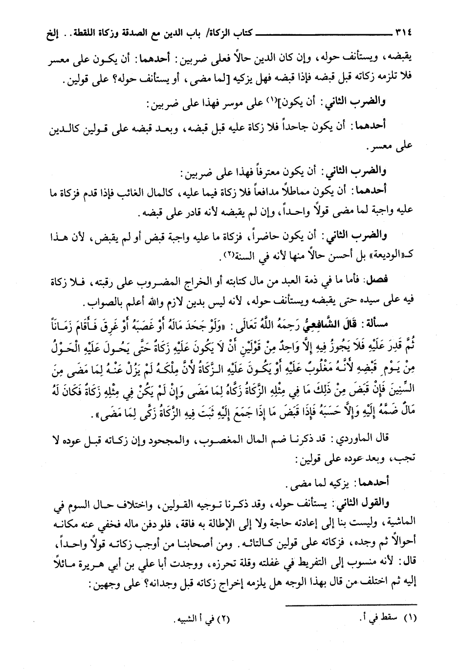 وَالْقَوْلُ الثَّانِي: يَسْتَأْنِفُ حَوْلَهُ، وقد ذكرنا تَوْجِيهَ الْقَوْلَيْنِ، وَاخْتِلَافَ حَالِ السَّوْمِ فِي الْمَاشِيَةِ، وَلَيْسَتْ بِنَا إِلَى إِعَادَتِهِ حَاجَةٌ وَلَا إِلَى الْإِطَالَةِ بِهِ فَاقَةٌ، فَلَوْ دَفَنَ مَالَهُ فَخَفِيَ عَنْهُ مَكَانَهُ أَحْوَالًا ثُمَّ وَجَدَهُ، فَزَكَاتُهُ عَلَى قَوْلَيْنِ كَالتَّائِهِ. وَمِنْ أَصْحَابِنَا مَنْ أَوْجَبَ زَكَاتَهُ قَوْلًا وَاحِدًا، قَالَ: لِأَنَّهُ مَنْسُوبٌ إِلَى التَّفْرِيطِ فِي غَفْلَتِهِ وَقِلَّةِ تَحَرُّزِهِ، وَوَجَدْتُ أَبَا عَلِيِّ بْنِ أَبِي هُرَيْرَةَ مَائِلًا إِلَيْهِ ثُمَّ اخْتَلَفَ مَنْ قَالَ بِهَذَا الْوَجْهِ هَلْ يَلْزَمُهُ إِخْرَاجُ زَكَاتِهِ قَبْلَ وِجْدَانِهِ؟ عَلَى وَجْهَيْنِ: