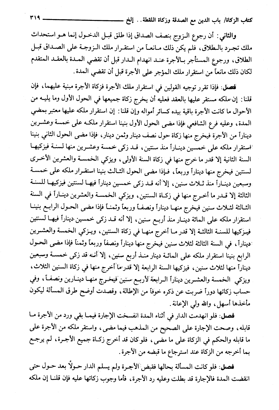 : فَإِذَا تَقَرَّرَ تَوْجِيهُ الْقَوْلَيْنِ فِي اسْتِقْرَارِ مِلْكِ الْأُجْرَةِ فَزَكَاةُ الْأُجْرَةِ مَبْنِيَّةٌ عليهما، فَإِنْ قُلْنَا: إِنَّ مِلْكَهُ مُسْتَقِرٌّ عَلَيْهَا بِالْعَقْدِ فَعَلَيْهِ أَنْ يُخْرِجَ زَكَاةَ جَمِيعِهَا فِي الْحَوْلِ الأول وما يَلِيهِ مِنَ الْأَحْوَالِ مَا كَانَتِ الْأُجْرَةُ بَاقِيَةً بِيَدِهِ كَسَائِرِ أَمْوَالِهِ وَإِنْ قُلْنَا: إِنَّ اسْتِقْرَارَ مِلْكِهِ عَلَيْهَا مُعْتَبَرٌ بِمُضِيِّ الْمُدَّةِ، وَعَلَيْهِ فَرَّعَ الشَّافِعِيُّ فَإِذَا مَضَى الْحَوْلُ الْأَوَّلُ بَنَيْنَا اسْتِقْرَارُ مِلْكِهِ عَلَى خَمْسَةٍ وَعِشْرِينَ دِينَارًا مِنَ الْأُجْرَةِ فَيُخْرِجُ مِنْهَا زَكَاةَ حَوْلٍ نِصْفَ دِينَارٍ وَثُمُنَ دِينَارٍ، فَإِذَا مَضَى الْحَوْلُ الثَّانِي بَنَيْنَا اسْتِقْرَارَ مِلْكِهِ عَلَى خَمْسِينَ دِينَارًا مُنْذُ سَنَتَيْنِ، قَدْ زَكَّى خَمْسَةً وَعِشْرِينَ مِنْهَا لِسَنَةٍ فَيُزَكِّيهَا السَّنَةَ الثَّانِيَةَ إِلَّا قَدْرَ مَا خَرَجَ مِنْهَا فِي زَكَاةِ السَّنَةِ الْأُولَى، وَيُزَكِّي الْخَمْسَةَ وَالْعِشْرِينَ الْأُخْرَى لِسَنَتَيْنِ فَيُخْرِجُ مِنْهَا دِينَارًا وَرُبْعًا، فَإِذَا مَضَى الْحَوْلُ الثَّالِثُ بَنَيْنَا اسْتِقْرَارَ مِلْكِهِ عَلَى خَمْسَةٍ وَسَبْعِينَ دِينَارًا مُنْذُ ثَلَاثِ سِنِينَ، إِلَّا أَنَّهُ قد زكى خمسين ديناراً فيها لسنتين فيزكيها للسنة الثَّالِثَةَ إِلَّا قَدْرَ مَا أَخْرَجَ مِنْهَا فِي زَكَاةِ السَّنَتَيْنِ، وَيُزَكِّي الْخَمْسَةَ وَالْعِشْرِينَ دِينَارًا فِي السَّنَةِ الثَّالِثَةِ لِثَلَاثِ سِنِينَ فَيُخْرِجُ مِنْهَا دِينَارًا وَنِصْفًا وَرُبْعًا وَثُمْنًا فَإِذَا مَضَى الْحَوْلُ الرَّابِعُ بَنِينَا اسْتِقْرَارَ مِلْكِهِ عَلَى الْمِائَةِ دِينَارٍ مُنْذُ أربع سِنِينَ، إِلَّا أَنَّهُ قَدْ زَكَّى خَمْسِينَ دِينَارًا فيها لسنتين فيزكيها للسنة الثَّالِثَةَ إِلَّا قَدْرَ مَا أَخْرَجَ مِنْهَا فِي زَكَاةِ السَّنَتَيْنِ، وَيُزَكِّي الْخَمْسَةَ وَالْعِشْرِينَ دِينَارًا، فِي السَّنَةِ الثَّالِثَةِ لِثَلَاثِ سِنِينَ فَيُخْرِجُ مِنْهَا دِينَارًا وَنِصْفًا وَرُبْعًا وَثُمْنًا فَإِذَا مَضَى الْحَوْلُ الرَّابِعُ بَنِينَا اسْتِقْرَارَ مِلْكِهِ عَلَى الْمِائَةِ دِينَارٍ مُنْذُ أَرْبَعِ سِنِينَ، إِلَّا أَنَّهُ قَدْ زَكَّى خَمْسَةً وَسَبْعِينَ دِينَارًا مِنْهَا لِثَلَاثِ سِنِينَ، فَيُزَكِّيهَا السَّنَةَ الرَّابِعَةَ إِلَّا قَدْرَ مَا أَخْرَجَ مِنْهَا فِي الزكاة السنين الثلاث ويزكي الخمسة والعسرين دِينَارًا الرَّابِعَةَ لِأَرْبَعِ سِنِينَ فَيُخْرِجُ مِنْهَا دِينَارَيْنِ ونصفاً، وفي حساب زكاتها دوراً ضربت عَنْ ذِكْرِهِ خَوْفًا مِنَ الْإِطَالَةِ، وَقَصَدْتُ أَوْضَحَ طُرُقِ الْمَسْأَلَةِ لِيَكُونَ مَأْخَذُهَا أَسْهَلَ، وَاللَّهُ وَلِيُّ الْإِعَانَةِ.