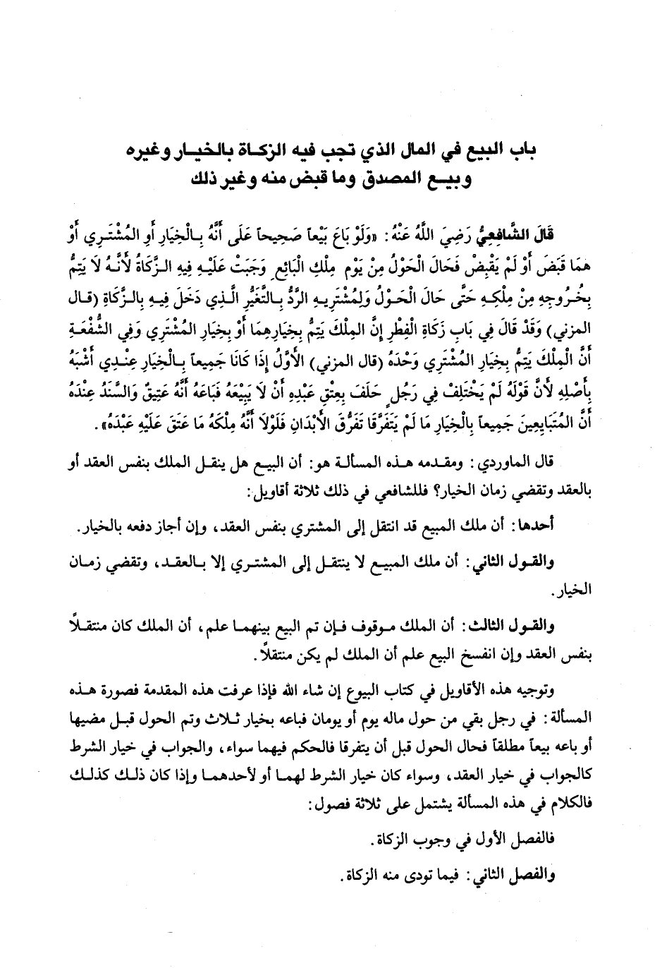 قال الشافعي رضي الله عنه: " وَلَوْ بَاعَ بَيْعًا صَحِيحًا عَلَى أَنَّهُ بِالْخِيَارِ أَوِ الْمُشْتَرِي أَوْ هُمَا قَبَضَ أَوْ لَمْ يَقْبِضْ فَحَالَ الْحَوْلُ مِنْ يَوْمِ مَلَكَ الْبَائِعُ وجبت عليه فيه الزكاة لأنه لا يتم بخروجه من ملكه حتى حال الحول ولمشتريه الرد بالتغير الذي دخل فيه بالزكاة (قال المزني) وقد قال في باب زكاة الفطر إن الملك يتم بخيارهما أو بخيار المشتري وفي الشفعة أن الملك يتم بخيار المشتري وحده (قال المزني) الأول إذا كانا جميعاً بالخيار عندي أشبه بأصله لأن قوله لم يختلف في رجل حَلَفَ بِعِتْقِ عَبْدِهِ أَنْ لَا يَبِيعَهُ فَبَاعَهُ أنه عتيق والسند عنده أن المتبايعين جميعاً بالخيار ما لم يتفرقا تفرق الأبدان فلولا أنه ملكه ما عتق عليه عبده ".