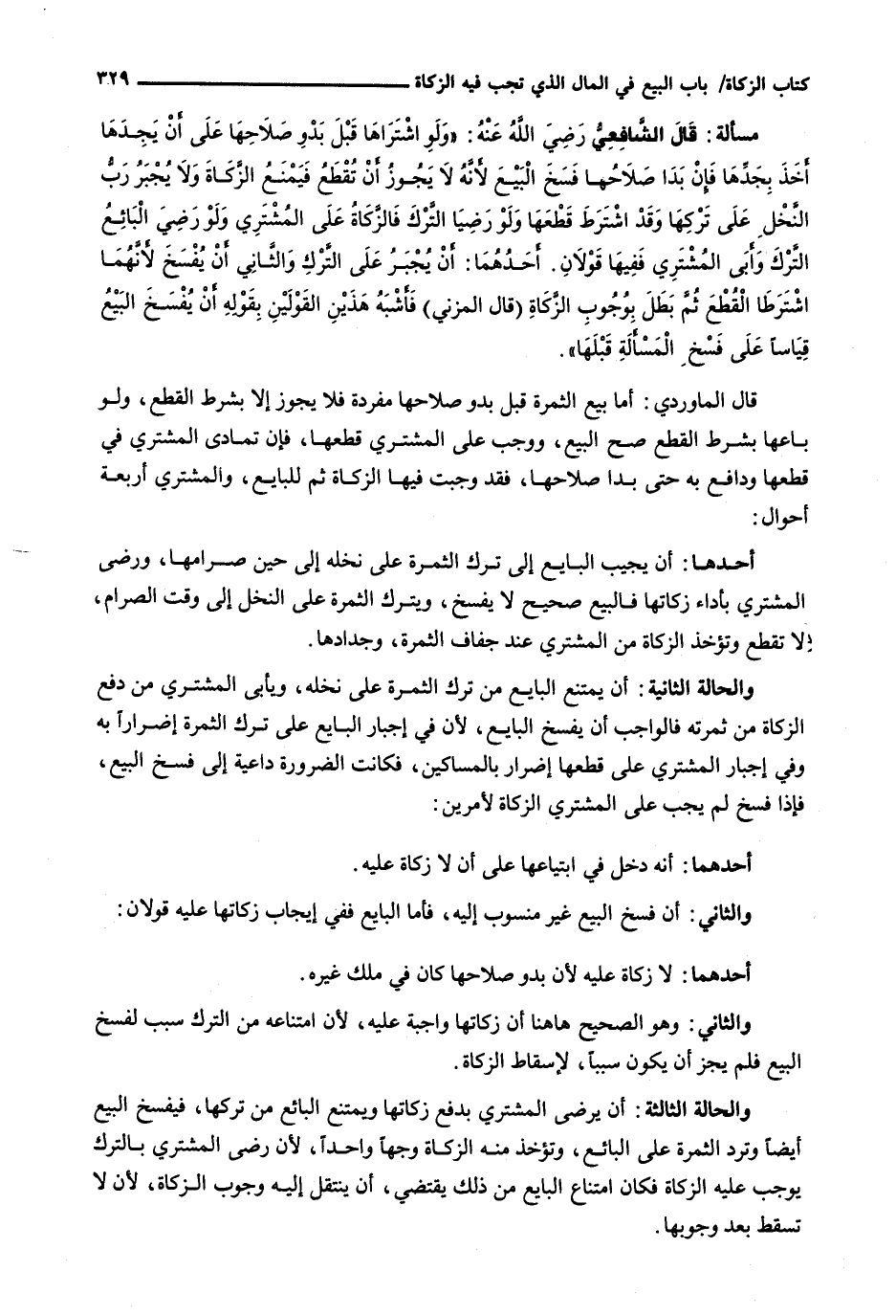قَالَ الْمَاوَرْدِيُّ: أَمَّا بَيْعُ الثَّمَرَةِ قَبْلَ بُدُوِّ صَلَاحِهَا مُفْرَدَةً فَلَا يَجُوزُ إِلَّا بِشَرْطِ الْقَطْعِ، وَلَوْ بَاعَهَا بِشَرْطِ الْقَطْعِ صَحَّ الْبَيْعُ، وَوَجَبَ عَلَى الْمُشْتَرِي قَطْعُهَا، فَإِنْ تَمَادَى الْمُشْتَرِي فِي قطعها ودافع بها حَتَّى بَدَا صَلَاحُهَا، فَقَدْ وَجَبَتْ فِيهَا الزَّكَاةُ ثم للبايع، والمشتري أربعة أحوال: