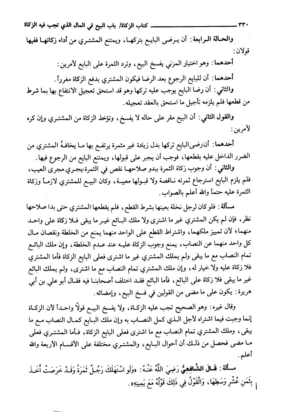 وَالثَّانِي: أَنَّ وُجُوبَ زَكَاةِ الثَّمَرَةِ بِبُدُوِّ صَلَاحِهَا نَقْصٌ فِي الثَّمَرَةِ يَجْرِي مجرى العيب، فلم يلزم البايع اسْتِرْجَاعَ ثَمَرَتِهِ نَاقِصَةً وَلَا قَبُولَهَا مَعِيبَةً، وَكَانَ الْبَيْعُ لِلْمُشْتَرِي لَازِمًا وَزَكَاةُ الثَّمَرَةِ عَلَيْهِ حَتْمًا وَاللَّهُ أَعْلَمُ بِالصَّوَابِ.