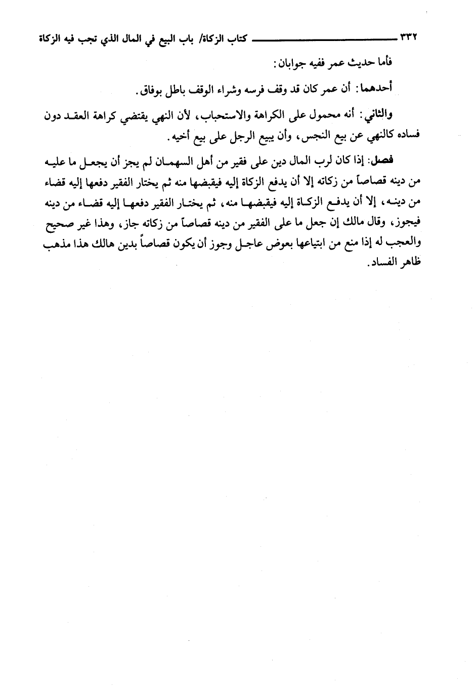 : إذا كَانَ لِرَبِّ الْمَالِ دَيْنٌ عَلَى فَقِيرٍ مِنْ أَهْلِ السُّهْمَانِ لَمْ يَجُزْ أَنْ يُجْعَلَ مَا عَلَيْهِ مِنْ دَيْنِهِ قِصَاصًا مِنْ زَكَاتِهِ إِلَّا أَنْ يَدْفَعَ الزَّكَاةَ إِلَيْهِ فَيَقْبِضَهَا مِنْهُ ثُمَّ يَخْتَارُ الْفَقِيرُ دَفْعَهَا إِلَيْهِ قَضَاءً مِنْ دَيْنِهِ، إِلَّا أَنْ يَدْفَعَ الزَّكَاةَ إِلَيْهِ فَيَقْبِضَهَا مِنْهُ، ثُمَّ يَخْتَارُ الْفَقِيرُ دَفْعَهَا إِلَيْهِ قَضَاءً مِنْ دَيْنِهِ فَيَجُوزُ، وَقَالَ مَالِكٌ إِنْ جَعَلَ مَا عَلَى الْفَقِيرِ مِنْ دَيْنِهِ قِصَاصًا مِنْ زَكَاتِهِ جَازَ، وَهَذَا غَيْرُ صَحِيحٍ وَالْعَجَبُ لَهُ إِذَا مَنَعَ مِنِ ابْتِيَاعِهَا بِعِوَضٍ عَاجِلٍ وَجَوَّزَ أَنْ يَكُونَ قِصَاصًا بِدَيْنٍ هَالِكٍ هَذَا مَذْهَبٌ ظَاهِرُ الفساد.