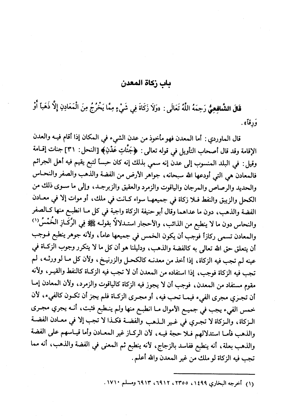 قَالَ الْمَاوَرْدِيُّ: أَمَّا الْمَعْدِنُ فَهُوَ مَأْخُوذٌ مِنْ عَدَنَ الشَّيْءَ فِي الْمَكَانِ إِذَا أَقَامَ فِيهِ وَالْعَدْنُ الْإِقَامَةُ وَقَدْ قَالَ أَصْحَابُ التَّأْوِيلِ فِي قَوْله تَعَالَى: {جَنَّاتِ عَدْنٍ) {النحل: 31) جَنَّاتِ إِقَامَةٍ وَقِيلَ: فِي الْبَلَدِ الْمَنْسُوبِ إِلَى عَدَنَ إِنَّهُ سُمِّيَ بِذَلِكَ إِنَّهُ كَانَ حَبْسًا لِتُبَّعٍ يُقِيمَ فِيهِ أَهْلُ الْجَرَائِمِ فَالْمَعَادِنُ هِيَ الَّتِي أَوْدَعَهَا اللَّهُ سُبْحَانَهُ، جَوَاهِرَ الْأَرْضِ مِنَ الْفِضَّةِ وَالذَّهَبِ وَالصُّفْرِ وَالنُّحَاسِ وَالْحَدِيدِ وَالرَّصَاصِ وَالْمَرْجَانِ وَالْيَاقُوتِ وَالزُّمُرُّدِ وَالْعَقِيقِ وَالزَّبَرْجَدِ، وَإِلَى مَا سِوَى ذَلِكَ مِنَ الكحل والزيبق وَالنِّفْطِ فَلَا زَكَاةَ فِي جَمِيعِهَا سَوَاءٌ كَانَتْ فِي مِلْكٍ، أَوْ مَوَاتٍ إِلَّا فِي مَعَادِنِ الْفِضَّةِ وَالذَّهَبِ، دُونَ مَا عَدَاهُمَا وَقَالَ أبو حنيفة الزَّكَاةُ وَاجِبَةٌ فِي كُلِّ مَا انْطَبَعَ مِنْهَا كَالصُّفْرِ وَالنُّحَاسِ دُونَ مَا لَا يَنْطَبِعُ مِنَ الذَّائِبِ، وَالْأَحْجَارِ اسْتِدْلَالًا بِقَوْلِهِ - صَلَّى اللَّهُ عَلَيْهِ وَسَلَّم َ - فِي الرَّكَازِ الْخُمُسُ وَالْمَعَادِنُ تُسَمَّى رِكَازًا فَوَجَبَ أَنْ يَكُونَ الْخُمُسُ فِي جَمِيعِهَا عَامًّا، وَلِأَنَّهُ جَوْهَرٌ يَنْطَبِعُ فَوَجَبَ أَنْ يَتَعَلَّقَ حَقُّ اللَّهِ تَعَالَى بِهِ كَالْفِضَّةِ وَالذَّهَبِ، وَدَلِيلُنَا هُوَ أَنَّ كُلَّ مَا لَا يَتَكَرَّرُ وُجُوبُ الزَّكَاةِ فِي عَيْنِهِ لَمْ تَجِبْ فِيهِ الزَّكَاةُ، إِذَا أُخِذَ مِنْ مَعْدِنِهِ كَالْكُحْلِ وَالزِّرْنِيخِ، وَلِأَنَّ كُلَّ مَا لَوْ وَرِثَهُ، لَمْ تَجِبْ فِيهِ الزَّكَاةُ فَوَجَبَ، إِذَا اسْتَفَادَهُ مِنَ الْمَعْدِنِ أَنْ لَا تَجِبَ فِيهِ الزَّكَاةُ كَالنِّفْطِ وَالْقِيرِ، وَلِأَنَّهُ مُقَوَّمٌ مُسْتَفَادٌ مِنَ الْمَعْدِنِ، فَوَجَبَ أَنْ لَا يَجُوزَ فِيهِ الزَّكَاةُ كَالْيَاقُوتِ وَالزُّمُرُّدِ، وَلِأَنَّ الْمَعَادِنَ إِمَّا أَنْ تَجْرِيَ مَجْرَى الْفَيْءَ فِيمَا تَجِبُ فِيهِ أَوْ مَجْرَى الزَّكَاةِ فَلَمْ يَجُزْ أَنْ تَكُونَ كَالْفَيْءِ، لِأَنَّ خُمُسَ الْفَيْءِ يَجِبُ فِي جَمِيعِ الْأَمْوَالِ ما انطبع منها ولم يَنْطَبِعْ فَثَبَتَ، أَنَّهُ يَجْرِي مَجْرَى الزَّكَاةِ، وَالزَّكَاةُ لَا تَجْرِي فِي غَيْرِ الذَّهَبِ وَالْفِضَّةِ فَكَذَا لَا تَجِبُ إِلَّا فِي مَعَادِنِ الْفِضَّةِ وَالذَّهَبِ فَأَمَّا اسْتِدْلَالُهُمْ فَلَا حُجَّةَ فِيهِ، لِأَنَّ الرِّكَازَ غَيْرُ الْمَعَادِنِ وَأَمَّا قِيَاسُهُمْ عَلَى الْفِضَّةِ وَالذَّهَبِ بِعِلَّةِ، أَنَّهُ يَنْطَبِعُ فَفَاسِدٌ بِالزُّجَاجِ، لِأَنَّهُ يَنْطَبِعُ ثُمَّ الْمَعْنَى فِي الْفِضَّةِ وَالذَّهَبِ، أَنَّهُ مِمَّا تَجِبُ فِيهِ الزَّكَاةُ لَوْ مَلَكَ مِنْ غَيْرِ المعدن والله أعلم.