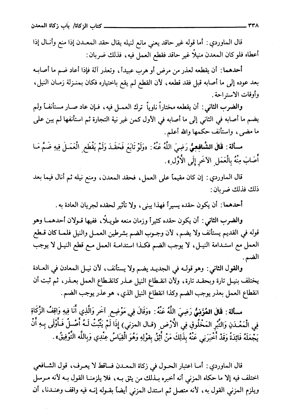 قَالَ الْمَاوَرْدِيُّ: أَمَّا اعْتِبَارُ الْحَوْلِ فِي زَكَاةِ الْمَعْدِنِ فَسَاقِطٌ لَا يُعْرَفُ، قَوْلُ الشَّافِعِيِّ اخْتَلَفَ فِيهِ إِلَّا مَا حَكَاهُ الْمُزَنِيُّ إِنَّهُ أَخْبَرَهُ بِذَلِكَ مَنْ يَثِقُ بِهِ، فَلَا يَلْزَمُنَا الْقَوْلُ بِهِ لِأَنَّهُ مُرْسَلٌ وَيَلْزَمُ الْمُزَنِيَّ الْقَوْلُ بِهِ، لِأَنَّهُ مُتَّصِلٌ ثُمَّ اسْتَدَلَّ الْمُزَنِيُّ أَيْضًا بِقَوْلِهِ إِنَّهُ فِيهِ وَاقِفٌ وَعِنْدَنَا، إِنَّ