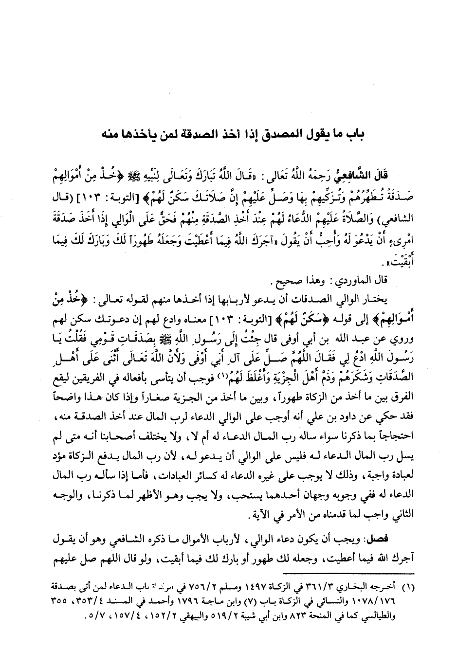 قَالَ الشَّافِعِيُّ رَحِمَهُ اللَّهُ تَعَالَى: " قَالَ اللَّهُ تبارك وتعالى لنبيه - صَلَّى اللَّهُ عَلَيْهِ وَسَلَّم َ - {خُذْ مِنْ أمْوِالِهِمْ صَدَقَةً تُطَهِّرُهُمْ وَتُزَكِّيهِمْ بِهَا وَصَلِّ عَلَيِْهِمْ إنَّ صَلاَتَكَ سَكَنٌ لَهُمْ) {التوبة: 103) (قَالَ الشَّافِعِيُّ) وَالصَلَاةُ عَلَيْهِمُ الدُّعَاءُ لَهُمْ عِنْدَ أَخْذِ الصَّدَقَةِ مِنْهُمْ فَحَقٌّ عَلَى الْوَالِي إِذَا أَخَذَ صَدَقَةَ امرئٍ أَنْ يَدْعُوَ لَهُ وَأُحِبُّ أَنْ يَقُولَ " آجَرَكَ اللَّهُ فِيمَا أَعْطَيْتَ وَجَعَلَهُ طهوراً لك وَبَارَكَ لَكَ فِيمَا أَبْقَيْتَ ".