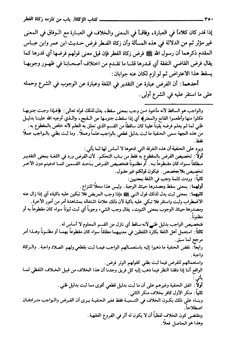 إِذَا قُدِّرَ كَانَ كَلَامًا فِي الْعِبَارَةِ، وِفَاقًا فِي الْمَعْنَى وَالْخِلَافُ فِي الْعِبَارَةِ مَعَ الْوِفَاقِ فِي الْمَعْنَى غَيْرُ مُؤَثِّرٍ ثُمَّ مِنَ الدَّلَالَةِ فِي هَذِهِ الْمَسْأَلَةِ وَإِنَّ زَكَاةَ الْفِطْرِ فَرْضُ حَدِيثِ ابْنِ عُمَرَ وَابْنِ عَبَّاسٍ الْمُقَدَّمِ ذِكْرُهُمَا أَنَّ رَسُولَ اللَّهِ - صَلَّى اللَّهُ عَلَيْهِ وَسَلَّم َ - فَرَضَ زَكَاةَ الْفِطْرِ فَإِنْ قِيلَ مَعْنَى قَوْلِهِمْ فَرَضَهَا أَيْ قَدَّرَهَا كَمَا يُقَالُ فَرَضَ الْقَاضِي النَّفَقَةَ أَيْ قَدَّرَهَا قُلْنَا مَا تَقَدَّمَ مِنِ اختلاف أصحابنا في ظهور وجوبها يقسط هَذَا الِاعْتِرَاضَ ثُمَّ لَوْ لَزِمَ لَكَانَ عَنْهُ جَوَابَانِ: