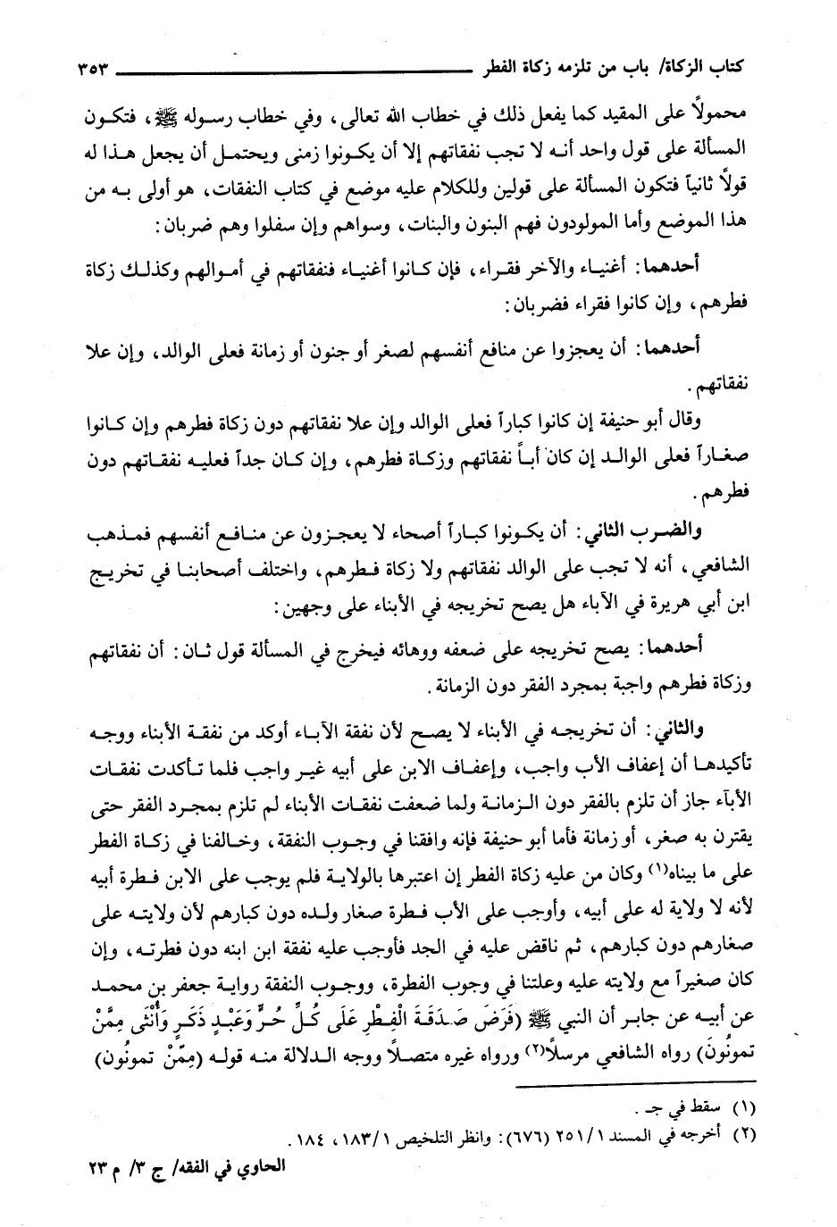 وَالثَّانِي: أَنَّ تَخْرِيجَهُ فِي الْأَبْنَاءِ لَا يَصِحُّ لِأَنَّ نَفَقَةَ الْآبَاءِ أَوْكَدُ مِنْ نَفَقَةِ الْأَبْنَاءِ وَوَجْهُ تَأْكِيدِهَا أَنَّ إِعْفَافَ الْأَبِ وَاجِبٌ، وَإِعْفَافَ الِابْنِ عَلَى أَبِيهِ غَيْرُ وَاجِبٍ فَلَمَّا تأكدت نفقات الأناء جَازَ أَنْ تَلْزَمَ بِالْفَقْرِ دُونَ الزَّمَانَةِ وَلَمَّا ضَعُفَتْ نَفَقَاتُ الْأَبْنَاءِ لَمْ تَلْزَمْ بِمُجَرَّدِ الْفَقْرِ حَتَّى يَقْتَرِنَ بِهِ صِغَرٌ، أَوْ زَمَانَةٌ فَأَمَّا أبو حنيفة فَإِنَّهُ وَافَقَنَا فِي وُجُوبِ النَّفَقَةِ، وخالفنا في زكاة الفطر على ما بيناه وكان من عليه زكاة الفطر إن اعْتَبَرَهَا بِالْوِلَايَةِ فَلَمْ يُوجِبْ عَلَى الِابْنِ فِطْرَةَ أَبِيهِ لِأَنَّهُ لَا وِلَايَةَ لَهُ عَلَى أَبِيهِ، وَأَوْجَبَ عَلَى الْأَبِ فِطْرَةَ صِغَارِ وَلَدِهِ دُونَ كِبَارِهِمْ لِأَنَّ وِلَايَتَهُ عَلَى صِغَارِهِمْ دُونَ كِبَارِهِمْ، ثم ناقض عليه فِي الْجَدِّ فَأَوْجَبَ عَلَيْهِ نَفَقَةَ ابْنِ ابْنِهِ دُونَ فِطْرَتِهِ، وَإِنْ كَانَ صَغِيرًا مَعَ وِلَايَتِهِ عَلَيْهِ وَعِلَّتُنَا فِي وُجُوبِ الْفِطْرَةِ، وَوُجُوبِ النَّفَقَةِ رِوَايَةُ جَعْفَرِ بْنِ مُحَمَّدٍ عَنْ أَبِيهِ عَنْ جَابِرٍ أَنَّ النَّبِيَّ - صَلَّى اللَّهُ عَلَيْهِ وَسَلَّم َ - (فَرَضَ صَدَقَةَ الْفِطْرِ عَلَى كُلِّ حُرٍّ وعبدٍ ذكرٍ وَأُنْثَى مِمَّنْ تَمُونُونَ) رَوَاهُ الشَّافِعِيُّ مُرْسَلًا وَرَوَاهُ غَيْرُهُ مُتَّصِلًا وَوَجْهُ الدَّلَالَةِ مِنْهُ قَوْلُهُ (ممن تمونون)