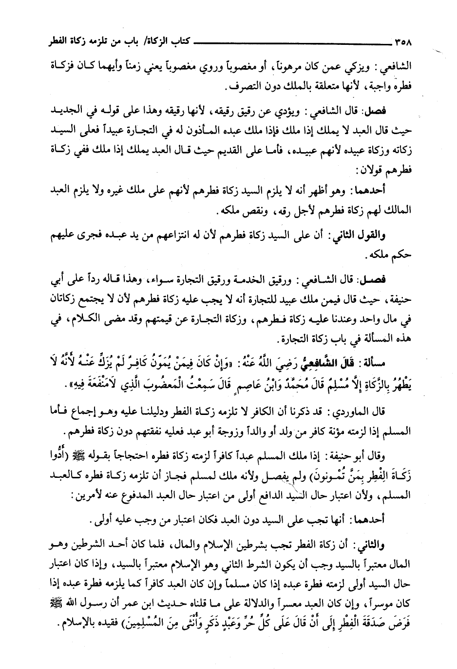 وَالثَّانِي: أَنَّ زَكَاةَ الْفِطْرِ تَجِبُ بِشَرْطَيْنِ الْإِسْلَامِ وَالْمَالِ، فَلَمَّا كَانَ أَحَدُ الشَّرْطَيْنِ وَهُوَ الْمَالُ مُعْتَبَرًا بِالسَّيِّدِ وَجَبَ أَنْ يَكُونَ الشَّرْطُ الثَّانِي وَهُوَ الْإِسْلَامُ مُعْتَبَرًا بِالسَّيِّدِ، وَإِذَا كَانَ اعْتِبَارُ حَالِ السَّيِّدِ أَوْلَى لَزِمَتْهُ فِطْرَةُ عَبْدِهِ إِذَا كَانَ مُسْلِمًا وَإِنْ كَانَ الْعَبْدُ كَافِرًا كَمَا يَلْزَمُهُ فِطْرَةُ عَبْدِهِ إِذَا كَانَ مُوسِرًا، وَإِنْ كَانَ الْعَبْدُ مُعْسِرًا وَالدَّلَالَةُ عَلَى مَا قُلْنَاهُ حَدِيثُ ابْنِ عُمَرَ أَنَّ رَسُولَ اللَّهِ - صَلَّى اللَّهُ عَلَيْهِ وَسَلَّم َ - (فَرَضَ صَدَقَةَ الْفِطْرِ إِلَى أَنْ قَالَ عَلَى كُلِّ حُرٍّ وعبدٍ ذكرٍ وَأُنْثَى مِنَ الْمُسْلِمِينَ) فقيده بالإسلام.