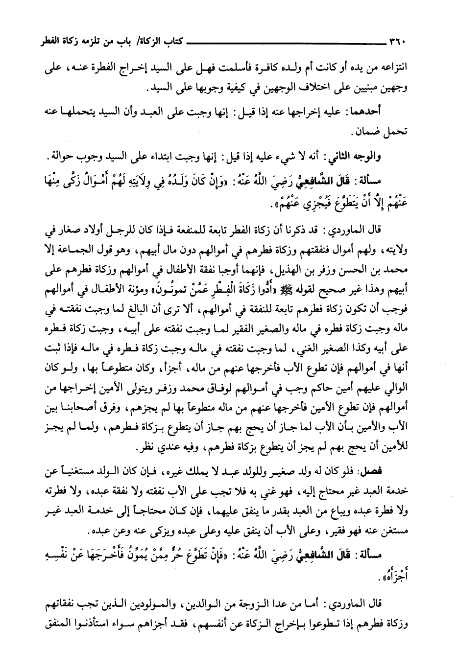 قال الماوردي: قد ذكرنا أن زكاة الفطر تابعة للمنفعة فَإِذَا كَانَ لِلرَّجُلِ أَوْلَادٌ صِغَارٌ فِي وِلَايَتِهِ، وَلَهُمْ أَمْوَالٌ فَنَفَقَتُهُمْ وَزَكَاةُ فِطْرِهِمْ فِي أَمْوَالِهِمْ دُونَ مَالِ أَبِيهِمْ، وَهُوَ قَوْلُ الْجَمَاعَةِ إِلَّا محمد بن الحسن وزفر بن الهذيل، فَإِنَّهُمَا أَوْجَبَا نَفَقَةَ الْأَطْفَالِ فِي أَمْوَالِهِمْ وَزَكَاةَ فِطْرِهِمْ عَلَى أَبِيهِمْ وَهَذَا غَيْرُ صَحِيحٍ لِقَوْلِهِ - صَلَّى اللَّهُ عَلَيْهِ وَسَلَّم َ - " أَدُّوا زَكَاةَ الْفِطْرِ عَمَّنْ تَمُونُونَ " وَمُؤْنَةُ الْأَطْفَالِ فِي أَمْوَالِهِمْ فَوَجَبَ أَنْ تَكُونَ زَكَاةُ فِطْرِهِمْ تَابِعَةً لِلنَّفَقَةِ فِي أَمْوَالِهِمْ، أَلَا تَرَى أَنَّ الْبَالِغَ لَمَّا وَجَبَتْ نَفَقَتُهُ فِي مَالِهِ وَجَبَتْ زَكَاةُ فِطْرِهِ فِي مَالِهِ وَالصَّغِيرُ الْفَقِيرُ لَمَّا وَجَبَتْ نَفَقَتُهُ عَلَى أَبِيهِ، وَجَبَتْ زَكَاةُ فِطْرِهِ عَلَى أَبِيهِ وَكَذَا الصَّغِيرُ الْغَنِيُّ، لَمَّا وَجَبَتْ نَفَقَتُهُ فِي مَالِهِ وَجَبَتْ زَكَاةُ فِطْرِهِ فِي مَالِهِ فَإِذَا ثَبَتَ أَنَّهَا فِي أَمْوَالِهِمْ فَإِنْ تَطَوَّعَ الْأَبُ فَأَخْرَجَهَا عَنْهُمْ مِنْ مَالِهِ، أَجْزَأَ، وَكَانَ مُتَطَوِّعًا بِهَا، وَلَوْ كَانَ الْوَالِي عَلَيْهِمْ أمين حاكم وجب في أموالهم لوفاق محمد وزفر وَيَتَوَلَّى الْأَمِينُ إِخْرَاجَهَا مِنْ أَمْوَالِهِمْ فَإِنْ تَطَوَّعَ الْأَمِينُ فَأَخْرَجَهَا عَنْهُمْ مِنْ مَالِهِ مُتَطَوِّعًا بِهَا لَمْ يُجْزِهِمْ، وَفَرَّقَ أَصْحَابُنَا بَيْنَ الْأَبِ وَالْأَمِينِ بِأَنَّ الْأَبَ لَمَّا جَازَ أَنْ يَحُجَّ بِهِمْ جَازَ أَنْ يَتَطَوَّعَ بِزَكَاةِ فِطْرِهِمْ، وَلَمَّا لَمْ يَجُزْ لِلْأَمِينِ أَنْ يَحُجَّ بِهِمْ لَمْ يَجُزْ أَنْ يَتَطَوَّعَ بِزَكَاةِ فِطْرِهِمْ، وَفِيهِ عِنْدِي نَظَرٌ.