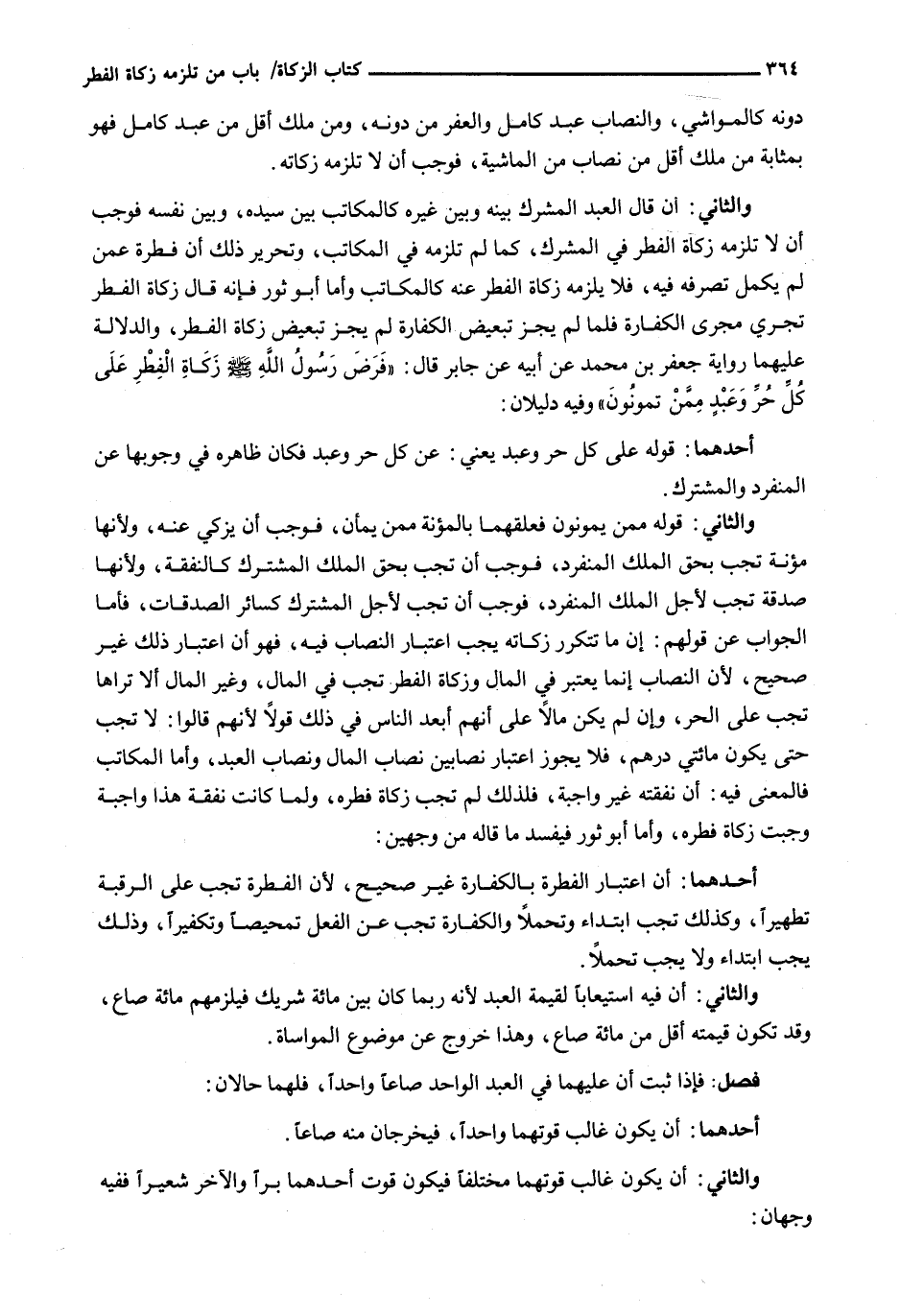 والثاني: قوله ممن يمونون فعلقهما بالمؤنة مِمَّنْ يُمَانُ، فَوَجَبَ أَنْ يُزَكَّى عَنْهُ، وَلِأَنَّهَا مُؤْنَةٌ تَجِبُ بِحَقِّ الْمِلْكِ الْمُنْفَرِدِ، فَوَجَبَ أَنْ تَجِبَ بِحَقِّ الْمِلْكِ الْمُشْتَرِكِ كَالنَّفَقَةِ، وَلِأَنَّهَا صَدَقَةٌ تَجِبُ لِأَجْلِ الْمِلْكِ الْمُنْفَرِدِ، فَوَجَبَ أَنْ تَجِبَ لأجل الْمُشْتَرِكِ كَسَائِرِ الصَّدَقَاتِ، فَأَمَّا الْجَوَابُ عَنْ قَوْلِهِمْ: إِنَّ مَا تَتَكَرَّرُ زَكَاتُهُ يَجِبُ اعْتِبَارُ النِّصَابِ فِيهِ، فَهُوَ أَنَّ اعْتِبَارَ ذَلِكَ غَيْرُ صَحِيحٍ، لِأَنَّ النِّصَابَ إِنَّمَا يُعْتَبَرُ فِي الْمَالِ وَزَكَاةُ الْفِطْرِ تَجِبُ فِي الْمَالِ، وَغَيْرِ الْمَالِ أَلَّا تَرَاهَا تَجِبُ عَلَى الْحُرِّ، وَإِنْ لَمْ يَكُنْ مَالًا عَلَى أَنَّهُمْ أَبْعَدُ النَّاسِ فِي ذَلِكَ قَوْلًا لِأَنَّهُمْ قَالُوا: لَا تَجِبُ حَتَّى يَكُونَ مِائَتَيْ دِرْهَمٍ، فَلَا يَجُوزُ اعْتِبَارُ نِصَابَيْنِ نِصَابَ الْمَالِ وَنِصَابَ الْعَبْدِ، وَأَمَّا الْمُكَاتَبُ فَالْمَعْنَى فِيهِ: أَنَّ نَفَقَتَهُ غَيْرُ وَاجِبَةٍ، فَلِذَلِكَ لَمْ تَجِبْ زَكَاةُ فِطْرِهِ، وَلَمَّا كَانَتْ نَفَقَةُ هَذَا وَاجِبَةً وَجَبَتْ زَكَاةُ فِطْرِهِ، وَأَمَّا أَبُو ثَوْرٍ فَيَفْسُدُ مَا قَالَهُ مِنْ وَجْهَيْنِ: