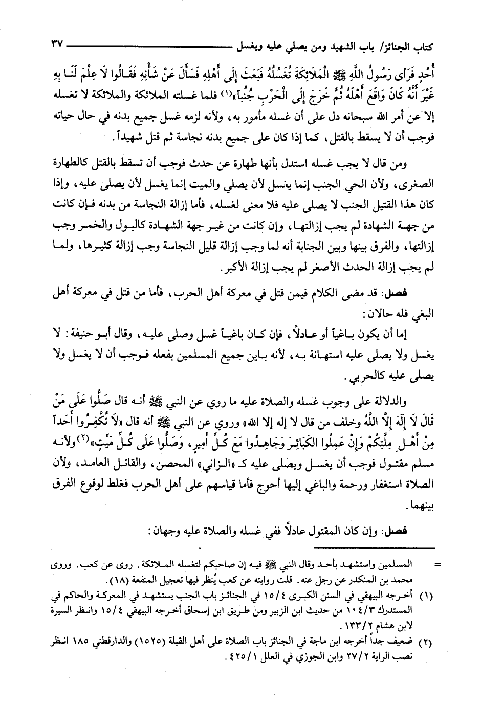 أحدٍ فَرَأَى رَسُولُ اللَّهِ - صَلَّى اللَّهُ عَلَيْهِ وَسَلَّم َ - الْمَلَائِكَةَ تُغَسِّلُهُ فَبَعَثَ إِلَى أَهْلِهِ فَسَأَلَ عَنْ شَأْنِهِ فَقَالُوا لَا عِلْمَ لَنَا بِهِ غَيْرَ أَنَّهُ كَانَ وَاقَعَ أَهْلَهُ ثُمَّ خَرَجَ إِلَى الْحَرْبِ جُنُبًا " فَلَمَّا غَسَّلَتْهُ الْمَلَائِكَةُ وَالْمَلَائِكَةُ لَا تُغَسِّلُهُ إِلَّا عَنْ أَمْرِ اللَّهِ سُبْحَانَهُ دَلَّ عَلَى أَنَّ غُسْلَهُ مَأْمُورٌ بِهِ، وَلِأَنَّهُ لَزِمَهُ غُسْلُ جَمِيعِ بَدَنِهِ فِي حَالِ حَيَاتِهِ فَوَجَبَ أَنْ لَا يَسْقُطَ بِالْقَتْلِ، كَمَا إِذَا كَانَ عَلَى جَمِيعِ بَدَنِهِ نَجَاسَةٌ ثُمَّ قُتِلَ شَهِيدًا.