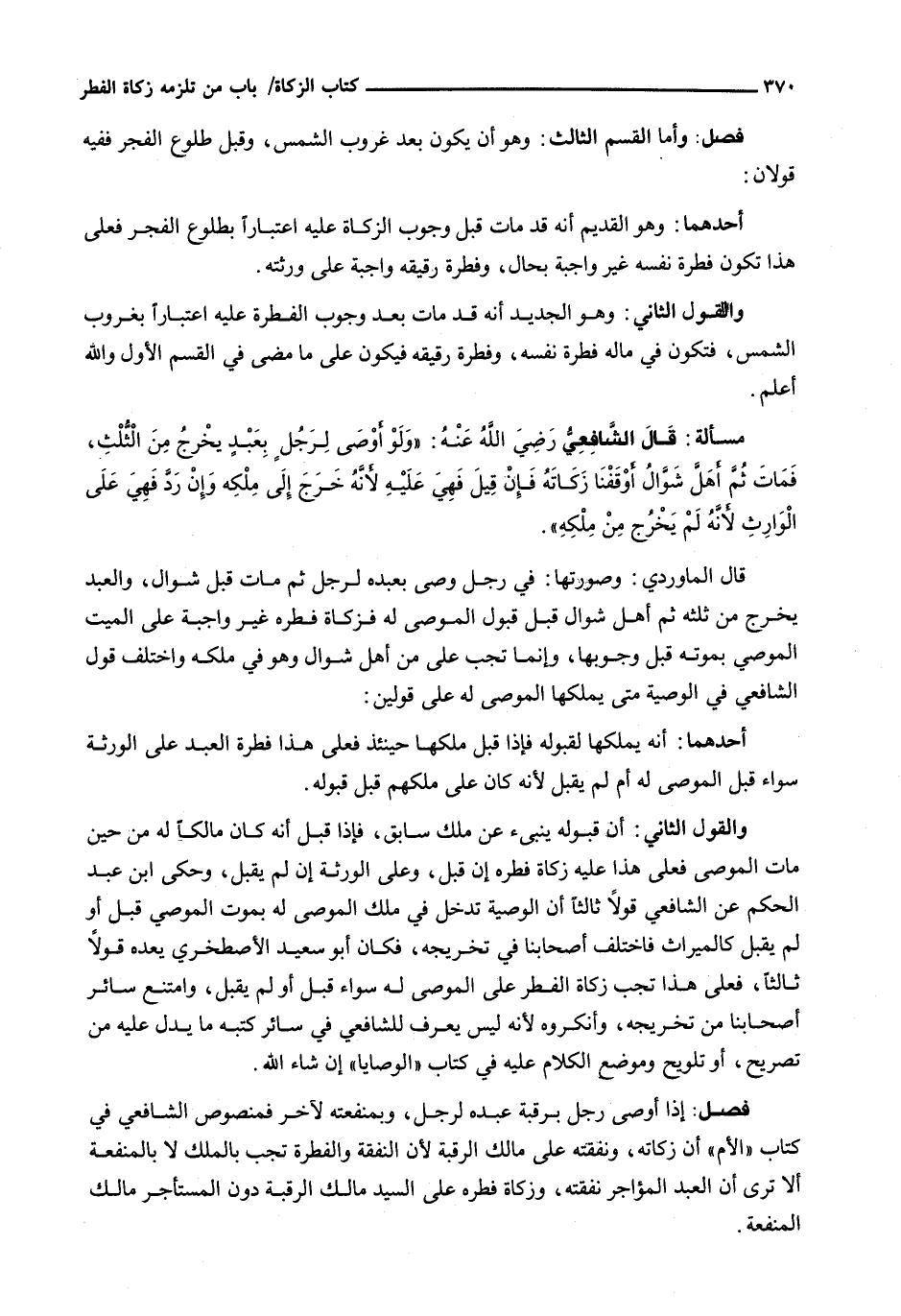 قَالَ الْمَاوَرْدِيُّ: وَصُورَتُهَا: فِي رَجُلٍ وَصَّى بِعَبْدِهِ لِرَجُلٍ ثُمَّ مَاتَ قَبْلَ شَوَّالٍ، وَالْعَبْدُ يَخْرُجُ مِنْ ثُلْثِهِ ثُمَّ أَهَلَّ شَوَّالٌ قَبْلَ قَبُولِ الْمُوصَى لَهُ فَزَكَاةُ فِطْرِهِ غَيْرُ واجبة على الميت الموصي بموته قَبْلَ وُجُوبِهَا، وَإِنَّمَا تَجِبُ عَلَى مَنْ أَهَلَّ شَوَّالٌ وَهُوَ فِي مِلْكِهِ وَاخْتَلَفَ قَوْلُ الشَّافِعِيِّ فِي الْوَصِيَّةِ مَتَى يَمْلِكُهَا الْمُوصَى لَهُ عَلَى قولين: