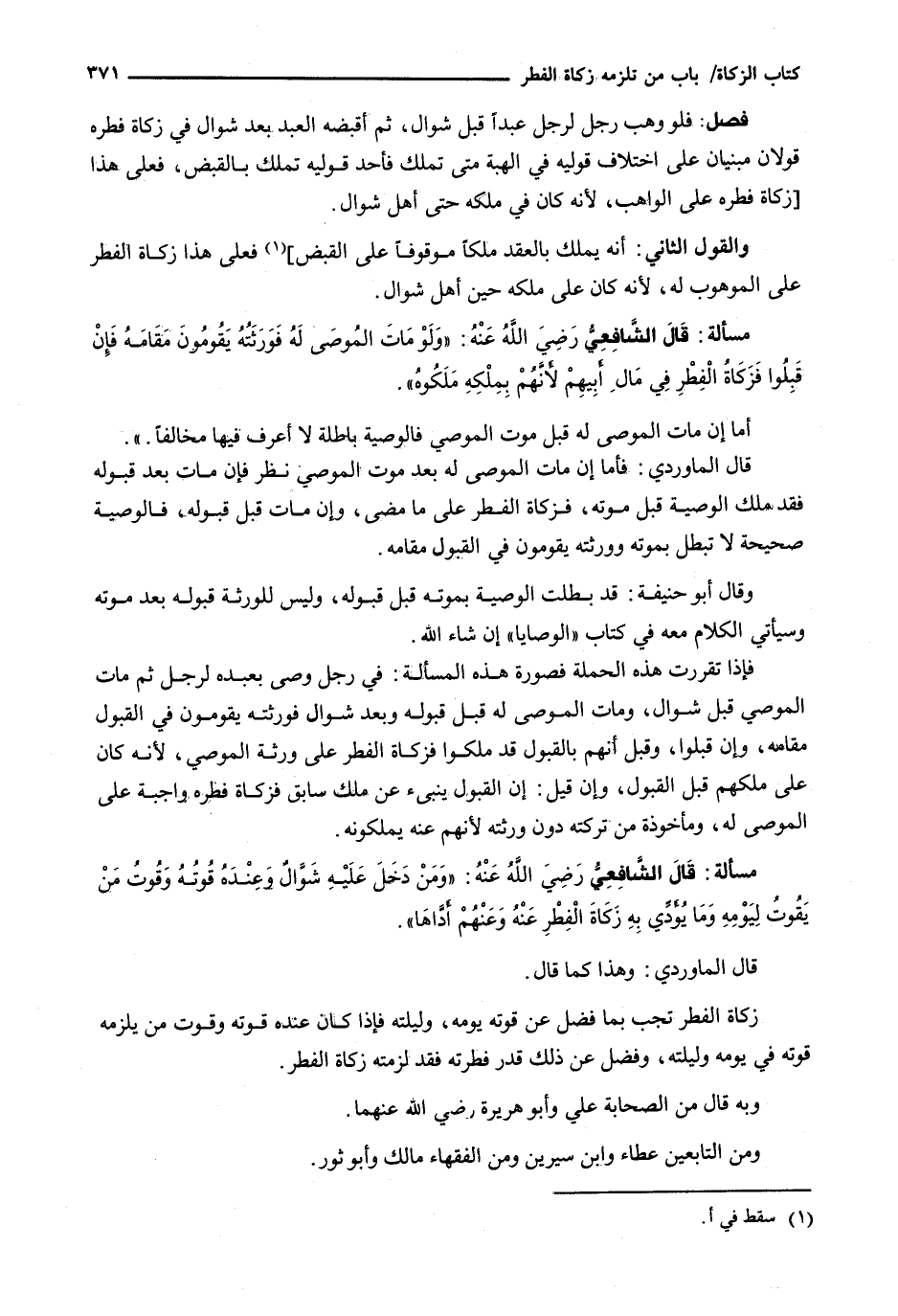 فَإِذَا تَقَرَّرَتْ هَذِهِ الحملة فَصُورَةُ هَذِهِ الْمَسْأَلَةِ: فِي رَجُلٍ وَصَّى بِعَبْدِهِ لِرَجُلٍ ثُمَّ مَاتَ الْمُوصِي قَبْلَ شَوَّالٍ، وَمَاتَ الْمُوصَى لَهُ قَبْلَ قَبُولِهِ وَبَعْدَ شَوَّالٍ فَوَرَثَتُهُ يقومون في القبول مقامه، وإن قبلوا، وقبل إِنَّهُمْ بِالْقَبُولِ قَدْ مَلَكُوا فَزَكَاةُ الْفِطْرِ عَلَى وَرَثَةِ الْمُوصِي، لِأَنَّهُ كَانَ عَلَى مِلْكِهِمْ قَبْلَ الْقَبُولِ، وَإِنْ قِيلَ: إِنَّ الْقَبُولَ يُنْبِئُ عَنْ ملك سابق فزكاة فطره وَاجِبَةٌ عَلَى الْمُوصَى لَهُ، وَمَأْخُوذَةٌ مِنْ تَرِكَتِهِ دُونَ وَرَثَتِهِ لِأَنَّهُمْ عَنْهُ يَمْلِكُونَهُ.