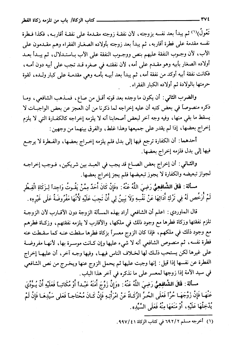 قَالَ الْمَاوَرْدِيُّ: اعْلَمْ أَنَّ الشَّافِعِيَّ أَرَادَ بِهَذِهِ الْمَسْأَلَةِ الزَّوْجَةَ دُونَ الْأَقَارِبِ لِأَنَّ الزَّوْجَةَ تَلْزَمُ نَفَقَتُهَا وَزَكَاةُ فِطْرِهَا مَعَ وُجُودِ ذَلِكَ فِي مِلْكِهَا، وَالْأَقَارِبُ لَا يَلْزَمُهُ نَفَقَتُهُمْ، وَزَكَاةُ فِطْرِهِمْ مَعَ وُجُودِ ذَلِكَ فِي مِلْكِهِمْ، فَإِذَا كَانَ الزَّوْجُ مُعْسِرًا بِزَكَاةِ فِطْرِهَا سَقَطَتْ عَنْهُ كَمَا سَقَطَتْ عَنْهُ فِطْرَةُ نَفْسِهِ، ثُمَّ مَنْصُوصُ الشَّافِعِيِّ أَنَّهُ لَا شَيْءَ عَلَيْهَا وَإِنْ كَانَتْ مُوسِرَةً بِهَا، لِأَنَّهَا مَفْرُوضَةٌ عَلَى غَيْرِهَا لَكِنْ يُسْتَحَبُّ ذَلِكَ لَهَا لِخِلَافِ النَّاسِ فِيهَا، وَفِيهَا وَجْهٌ آخَرُ، أَنَّ عَلَيْهَا إِخْرَاجَ الْفِطْرَةِ عَنْ نَفْسِهَا إِذَا قِيلَ: إِنَّهَا وَجَبَتْ عَلَيْهَا ثُمَّ يَحْمِلُ الزَّوْجُ عَنْهَا وَيَخْرُجُ مِنْ نَصِّ الشَّافِعِيِّ فِي سَيِّدِ الْأَمَةِ إِذَا زَوَّجَهَا لِمُعْسِرٍ عَلَى مَا نَذْكُرُهُ فِي آخر هذا الباب.