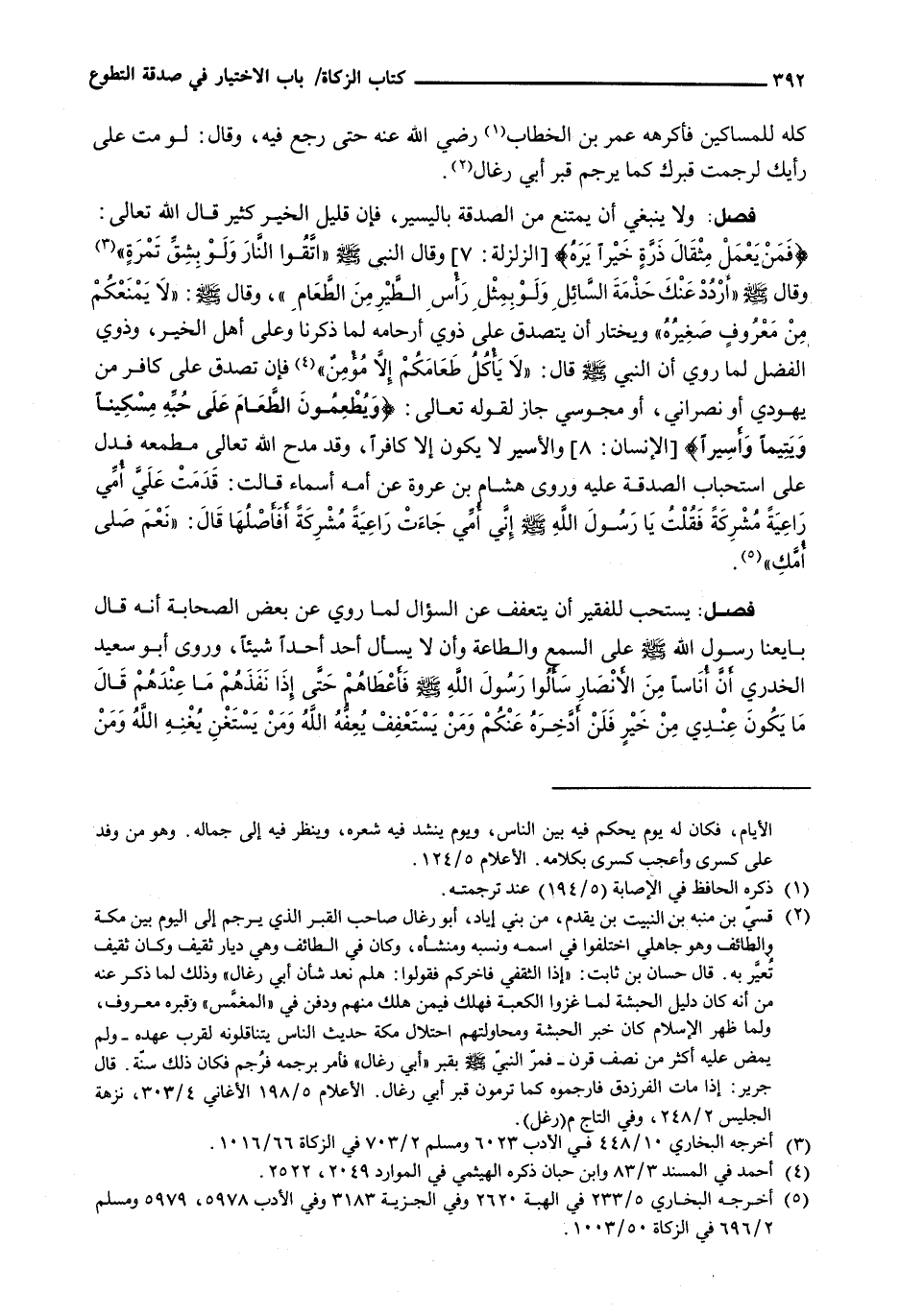 : وَلَا يَنْبَغِي أَنْ يَمْتَنِعَ مِنَ الصَّدَقَةِ بِالْيَسِيرِ، فَإِنَّ قَلِيلَ الْخَيْرِ كَثِيرٌ قَالَ اللَّهُ تَعَالَى: {فَمَنْ يَعْمَلْ مِثْقَالَ ذَرَّةٍ خَيْرًا يَرَهُ) {الزلزلة: 7) وقال النبي - صَلَّى اللَّهُ عَلَيْهِ وَسَلَّم َ - " اتَّقُوا النَّارَ وَلَوْ بِشِقِّ تمرةٍ " وَقَالَ - صَلَّى اللَّهُ عَلَيْهِ وَسَلَّم َ - " أُرْدُدْ عَنْكَ حَذْمَةَ السَّائِلِ وَلَوْ بِمِثْلِ رَأْسِ الطَّيْرِ مِنَ الطَّعَامِ "، وَقَالَ - صَلَّى اللَّهُ عَلَيْهِ وَسَلَّم َ -: " لَا يَمْنَعْكُمْ مِنْ معروفٍ صَغِيرَهُ " وَيَخْتَارُ أَنْ يتصدق على ذوي أرحامه لما ذكرنا وَعَلَى أَهْلِ الْخَيْرِ، وَذَوِي الْفَضْلِ لِمَا رُوِيَ أَنَّ النَّبِيَّ - صَلَّى اللَّهُ عَلَيْهِ وَسَلَّم َ - قَالَ: " لَا يَأْكُلْ طَعَامَكُمْ إِلَّا مؤمنٌ " فَإِنْ تُصَدِّقَ عَلَى كَافِرٍ مِنْ يَهُودِيٍّ أَوْ نَصْرَانِيٍّ، أَوْ مَجُوسِيٍّ جَازَ لِقَوْلِهِ تَعَالَى: {وَيُطْعِمُونَ الطَّعَامَ عَلَى حُبِّهِ مِسْكِيناً وَيَتِيماً وَأَسِيراً) {الإنسان: 8) وَالْأَسِيرُ لَا يَكُونُ إِلَّا كَافِرًا، وَقَدْ مَدَحَ اللَّهُ تعالى مطمعه فَدَلَّ عَلَى اسْتِحْبَابِ الصَّدَقَةِ عَلَيْهِ وَرَوَى هشامٍ بْنُ عُرْوَةَ عَنْ أُمِّهِ أَسْمَاءَ قَالَتْ: قَدِمَتْ على أمي راعيةً مشركةً فَقُلْتُ يَا رَسُولَ اللَّهِ - صَلَّى اللَّهُ عَلَيْهِ وَسَلَّم َ - إني أمي جاءت راعية مُشْرِكَةً أَفَأَصِلُهَا قَالَ: " نَعَمْ صِلِي أُمَّكِ ".
