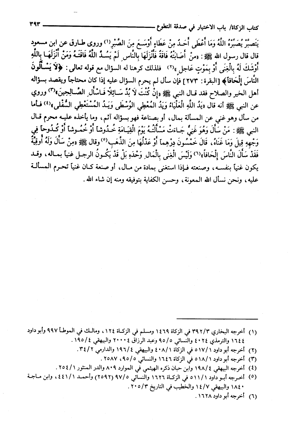 يَتَصَبَّرْ يُصَبِّرْهُ اللَّهُ وَمَا أُعْطِيَ أحدٌ مِنْ عطاءٍ أَوْسَعَ مِنَ الصَّبْرِ وَرَوَى طَارِقٌ عَنِ ابْنُ مَسْعُودٍ قَالَ قَالَ رَسُولُ اللَّهِ - صَلَّى اللَّهُ عَلَيْهِ وَسَلَّم َ -: " مَنْ أَصَابَتْهُ فاقةٌ فَأَنْزَلَهَا بِالنَّاسِ لَمْ يَسُدَّ اللَّهُ فَاقَتَهُ وَمَنْ أَنْزَلَهَا بِاللَّهِ أَوْشَكَ لَهُ بِالْغِنَى أَوْ بِمَوْتٍ عاجلٍ " فَلِذَلِكَ كَرِهْنَا لَهُ السُّؤَالَ مَعَ قَوْله تَعَالَى: {لاَ يَسْأَلُونَ النَّاسَ إلْحَافاً) {البقرة: 273) فَإِنْ سَأَلَ لَمْ يَحْرُمِ السُّؤَالُ عَلَيْهِ إِذَا كَانَ مُحْتَاجًا وَيَقْصِدُ بِسُؤَالِهِ أَهْلَ الْخَيْرِ وَالصَّلَاحِ فَقَدْ قَالَ النَّبِيُّ - صَلَّى اللَّهُ عَلَيْهِ وَسَلَّم َ - " إِنْ كُنْتَ لَا بُدَّ سَائِلًا فَاسْأَلِ الصَّالِحِينَ " وَرُوِيَ عَنِ النَّبِيِّ - صَلَّى اللَّهُ عَلَيْهِ وَسَلَّم َ - أنه قال " يد الله العلياء وَيَدُ الْمُعْطِي الْوُسْطَى وَيَدُ الْمُسْتَعْطِي السُّفْلَى " فَأَمَّا مَنْ سَأَلَ وَهُوَ غَنِيٌّ عَنِ الْمَسْأَلَةِ بِمَالٍ، أَوْ بِصِنَاعَةٍ فَهُوَ بِسُؤَالِهِ آثِمٌ، وَمَا يَأْخُذُهُ عَلَيْهِ مُحَرَّمٌ قَالَ النَّبِيُّ - صَلَّى اللَّهُ عَلَيْهِ وَسَلَّم َ -: مَنْ سَأَلَ وَهُوَ غَنِيٌّ جَاءَتْ مَسْأَلَتُهُ يَوْمَ الْقِيَامَةِ خُدُوشًا أَوْ خُمُوشًا أَوْ كُدُوحًا فِي وَجْهِهِ قِيلَ وَمَا غِنَاهُ، قَالَ خَمْسُونَ دِرْهَمًا أَوْ عَدْلُهَا مِنَ الذَّهَبِ وَقَالَ - صَلَّى اللَّهُ عَلَيْهِ وَسَلَّم َ - " مَنْ سَأَلَ وَلَهُ أُوقِيَّةٌ فَقَدْ سَأَلَ النَّاسَ إلحافاً " وليس الغنى بالمال وحده بل قد يَكُونُ الرَّجُلُ غَنِيًّا بِمَالِهِ، وَقَدْ يَكُونُ غَنِيًّا بِنَفْسِهِ، وَصَنْعَتِهِ فَإِذَا اسْتَغْنَى بِمَادَّةٍ مَنْ مَالٍ، أو صنعة كَانَ غَنِيًّا تَحْرُمُ الْمَسْأَلَةُ عَلَيْهِ، وَنَحْنُ نَسْأَلُ اللَّهَ الْمَعُونَةَ، وَحُسْنَ الْكِفَايَةِ بِتَوْفِيقِهِ وَمِنْهُ إِنْ شاء الله.