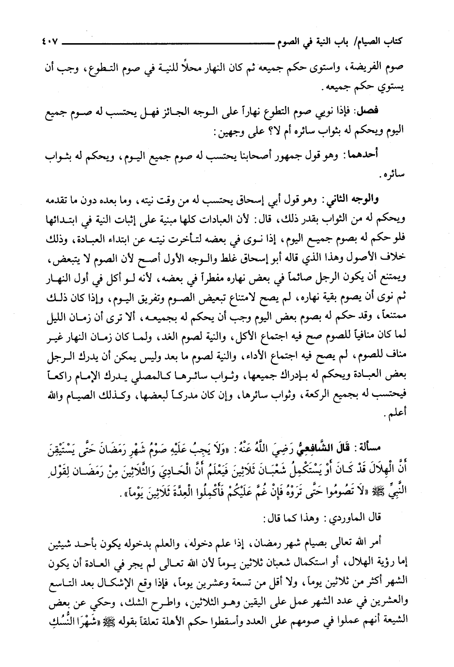 : فإذا نويي صَوْمَ التَّطَوُّعِ نَهَارًا عَلَى الْوَجْهِ الْجَائِزِ فَهَلْ يُحْتَسَبُ لَهُ صَوْمُ جَمِيعِ الْيَوْمِ وَيُحْكَمُ لَهُ بِثَوَابِ سَائِرِهِ أَمْ لَا؟ عَلَى وَجْهَيْنِ: