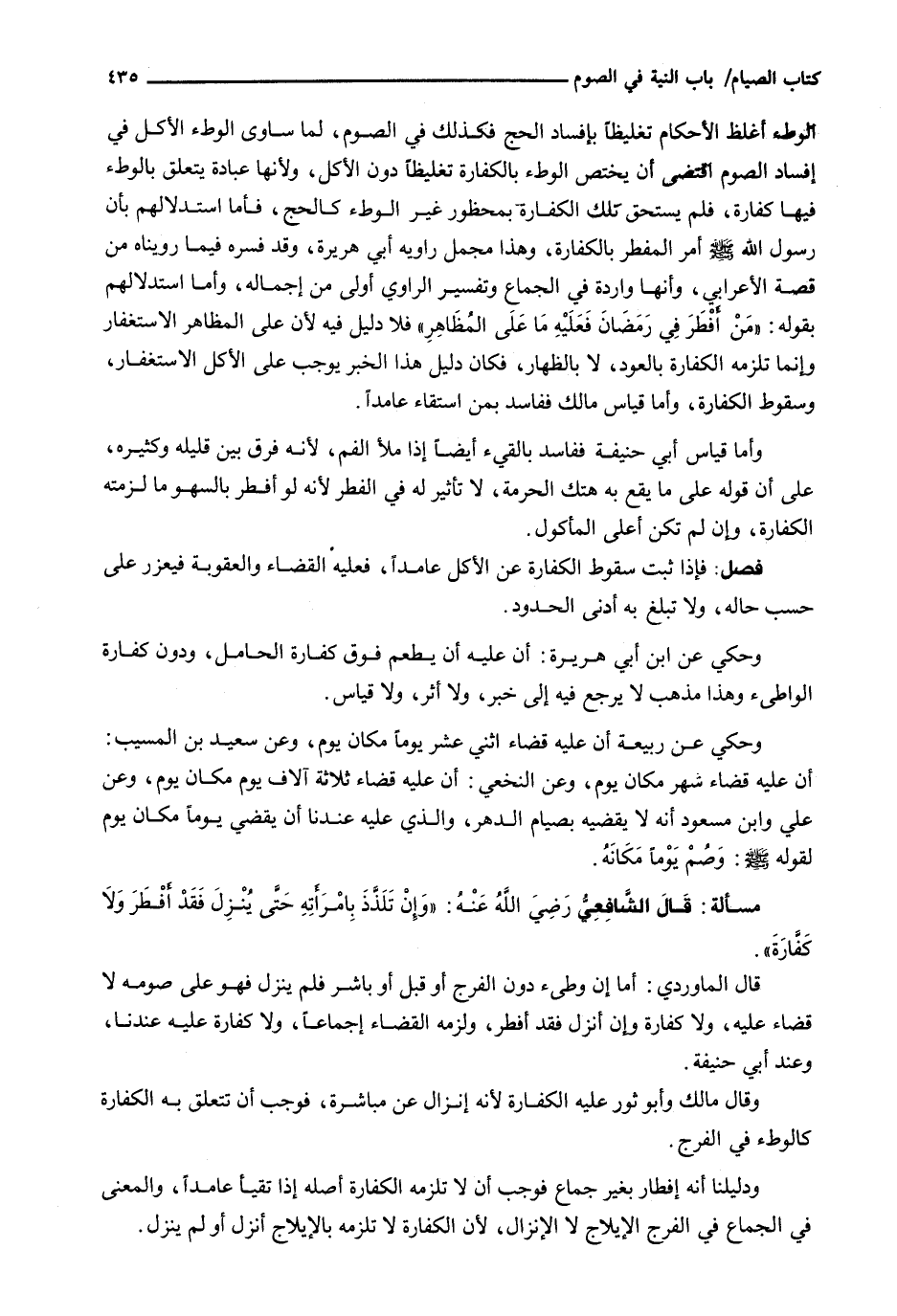 الوطء أغلظ الْأَحْكَامِ تَغْلِيظًا بِإِفْسَادِ الْحَجِّ فَكَذَلِكَ فِي الصَّوْمِ، لَمَّا سَاوَى الْوَطْءُ الْأَكْلَ فِي إِفْسَادِ الصَّوْمِ اقْتَضَى أَنْ يَخْتَصَّ الْوَطْءُ بِالْكَفَّارَةِ تَغْلِيظًا دُونَ الْأَكْلِ، وَلِأَنَّهَا عِبَادَةٌ يَتَعَلَّقُ بِالْوَطْءِ فِيهَا كَفَّارَةٌ، فَلَمْ يُسْتَحَقَّ تِلْكَ الْكَفَّارَةَ بِمَحْظُورٍ غَيْرِ الْوَطْءِ كَالْحَجِّ، فَأَمَّا اسْتِدْلَالُهُمْ بِأَنَّ رَسُولَ اللَّهِ - صَلَّى اللَّهُ عَلَيْهِ وَسَلَّم َ - أَمَرَ الْمُفْطِرَ بِالْكَفَّارَةِ، وَهَذَا مُجْمَلُ رَاوِيَةِ أَبِي هُرَيْرَةَ، وَقَدْ فَسَّرَهُ فِيمَا رَوَيْنَاهُ مِنْ قِصَّةِ الْأَعْرَابِيِّ، وَأَنَّهَا وَارِدَةٌ فِي الْجِمَاعِ وَتَفْسِيرُ الرَّاوِي أَوْلَى مِنْ إِجْمَالِهِ، وَأَمَّا اسْتِدْلَالُهُمْ بِقَوْلِهِ: " مَنْ أَفْطَرَ فِي رَمَضَانَ فَعَلَيْهِ مَا عَلَى الْمُظَاهِرِ " فَلَا دَلِيلَ فِيهِ لِأَنَّ عَلَى الْمُظَاهِرِ الِاسْتِغْفَارُ وَإِنَّمَا تَلْزَمُهُ الْكَفَّارَةُ بِالْعَوْدِ، لَا بِالظِّهَارِ، فَكَانَ دَلِيلُ هَذَا الْخَبَرِ يُوجِبُ عَلَى الْأَكْلِ الِاسْتِغْفَارَ، وَسُقُوطَ الْكَفَّارَةِ، وَأَمَّا قِيَاسُ مَالِكٍ فَفَاسِدٌ بِمَنِ اسْتَقَاءَ عَامِدًا.