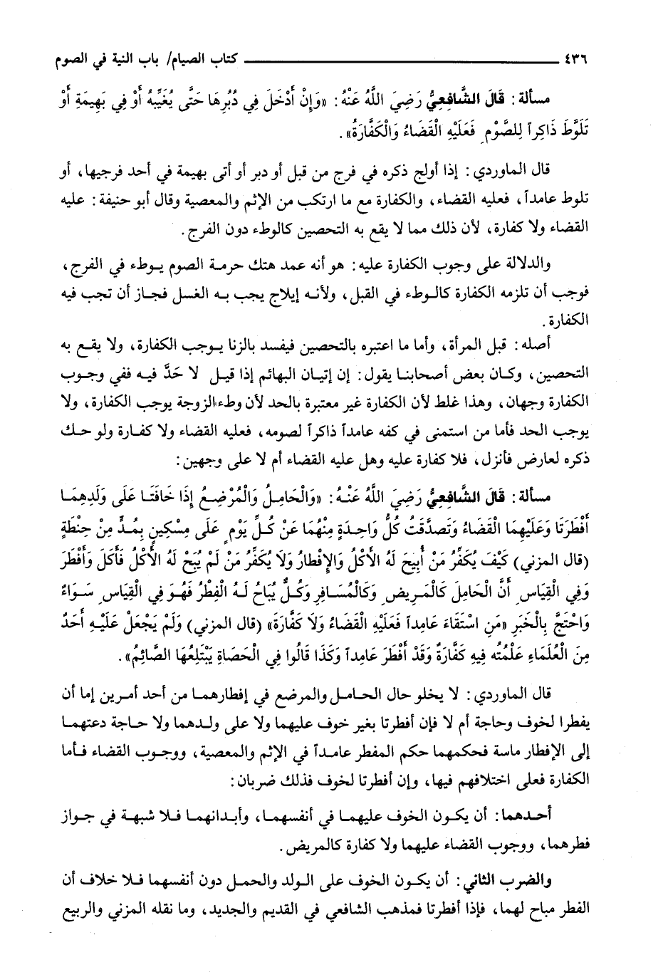 أَصْلُهُ: قُبُلُ الْمَرْأَةِ، وَأَمَّا مَا اعْتَبَرَهُ بِالتَّحْصِينِ فَيَفْسُدُ بِالزِّنَا يُوجِبُ الْكَفَّارَةَ، وَلَا يَقَعُ بِهِ التَّحْصِينُ، وَكَانَ بَعْضُ أَصْحَابِنَا يَقُولُ: إِنَّ إِتْيَانَ الْبَهَائِمِ إِذَا قِيلَ لَا حَدَّ فِيهِ فَفِي وُجُوبِ الْكَفَّارَةِ وَجْهَانِ، وَهَذَا غَلَطٌ لِأَنَّ الْكَفَّارَةَ غَيْرُ مُعْتَبَرَةٍ بِالْحَدِّ لِأَنَّ وَطْءَ الزَّوْجَةِ يُوجِبُ الْكَفَّارَةَ، وَلَا يُوجِبُ الْحَدَّ فَأَمَّا مَنِ اسْتَمْنَى فِي كَفِّهِ عَامِدًا ذَاكِرًا لِصَوْمِهِ، فَعَلَيْهِ الْقَضَاءُ وَلَا كَفَّارَةَ وَلَوْ حَكَّ ذَكَرَهُ لِعَارِضٍ فَأَنْزَلَ، فَلَا كَفَّارَةَ عَلَيْهِ وَهَلْ عَلَيْهِ الْقَضَاءُ أَمْ لَا عَلَى وجهين: