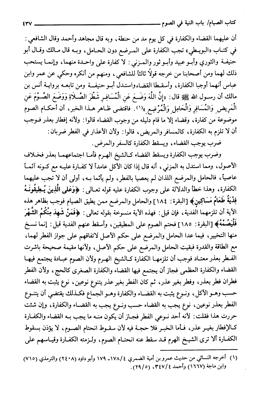 أَنَّ عَلَيْهِمَا الْقَضَاءَ وَالْكَفَّارَةَ فِي كُلِّ يَوْمٍ مُدٌّ مِنْ حِنْطَةٍ، وَبِهِ قَالَ مُجَاهِدٌ وَأَحْمَدُ وَقَالَ الشَّافِعِيُّ: فِي كِتَابِ " الْبُوَيْطِيِّ " تَجِبُ الْكَفَّارَةُ عَلَى الْمُرْضِعِ دُونَ الْحَامِلِ، وَبِهِ قَالَ مَالِكٌ وَقَالَ أبو حنيفة وَالثَّوْرِيُّ وَأَبُو عَبِيدٍ وَأَبُو ثَوْرٍ وَالْمُزَنِيُّ: لَا كَفَّارَةَ عَلَى وَاحِدَةٍ مِنْهُمَا، وإنما يتسحب ذك لَهُمَا وَمِنْ أَصْحَابِنَا مَنْ خَرَّجَهُ قَوْلًا ثَالِثًا للشافعي، ومنهم من أنكره وحكي عن عُمَرَ وَابْنِ عَبَّاسٍ أَنَّهُمَا أَوْجَبَا الْكَفَّارَةَ، وَأَسْقَطَا الْقَضَاءَ وَاسْتَدَلَّ أبو حنيفة وَمَنْ تَابَعَهُ بِرِوَايَةِ أَنَسِ بْنِ مَالِكٍ أَنَّ رَسُولَ اللَّهِ - صَلَّى اللَّهُ عَلَيْهِ وَسَلَّم َ - قال: " إن الله وضع على الْمُسَافِرِ شَطْرَ الصَّلَاةِ وَوَضَعَ الصَّوْمَ عَنِ الْمَرِيضِ وَالْمُسَافِرِ وَالْحَامِلِ وَالْمُرْضِعِ ". فَاقْتَضَى ظَاهِرُ هَذَا الْخَبَرِ، أَنَّ أَحْكَامَ الصَّوْمِ مَوْضُوعَةٌ مِنْ كَفَّارَةٍ، وَقَضَاءٍ إِلَّا مَا قَامَ دَلِيلُهُ مِنْ وُجُوبِ الْقَضَاءِ قَالُوا: وَلِأَنَّهُ إِفْطَارٌ بِعُذْرٍ فَوَجَبَ أَنْ لَا تَلْزَمَ بِهِ الْكَفَّارَةُ، كَالْمُسَافِرِ وَالْمَرِيضِ، قَالُوا: وَلِأَنَّ الْأَعْذَارَ فِي الْفِطْرِ ضَرْبَانِ: