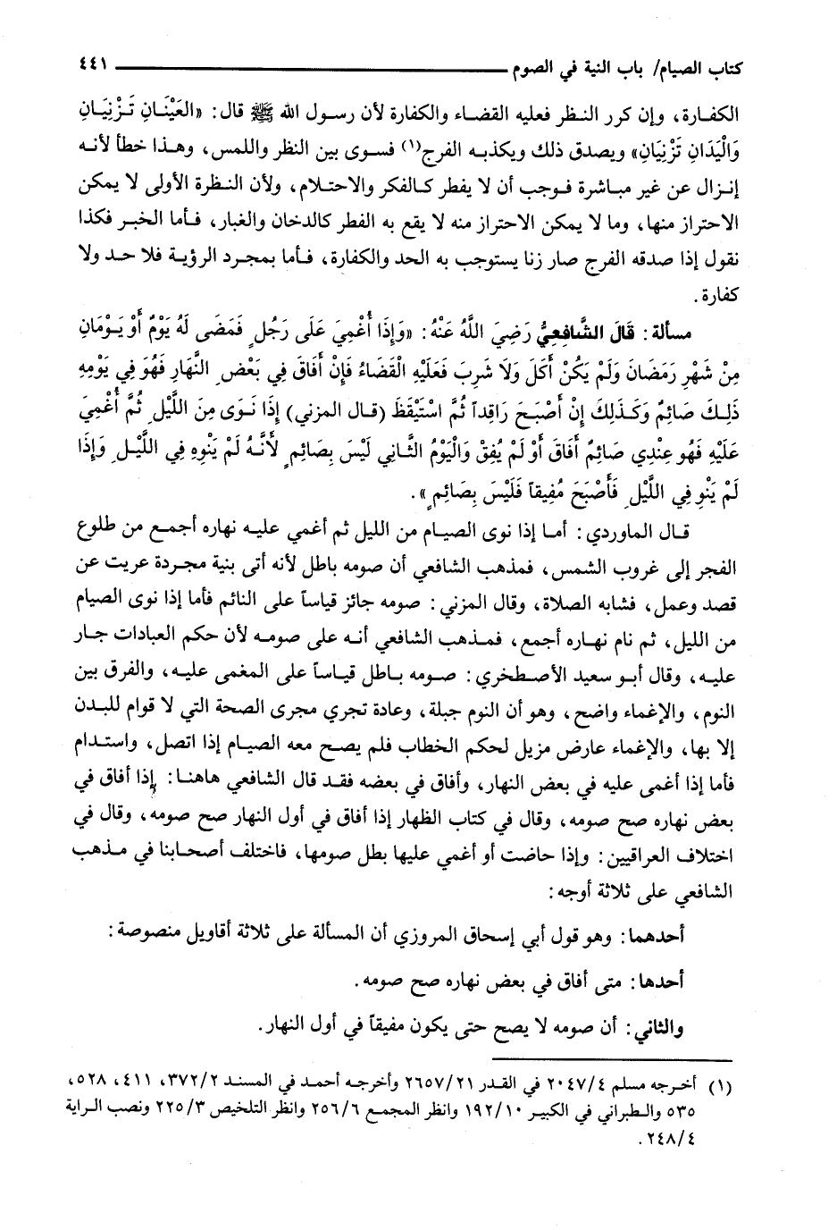 قَالَ الْمَاوَرْدِيُّ: أَمَّا إِذَا نَوَى الصِّيَامَ مِنَ اللَّيْلِ ثُمَّ أُغْمِيَ عَلَيْهِ نَهَارَهُ أَجْمَعَ مِنْ طُلُوعِ الْفَجْرِ إِلَى غُرُوبِ الشَّمْسِ، فَمَذْهَبُ الشَّافِعِيِّ أَنَّ صَوْمَهُ بَاطِلٌ لِأَنَّهُ أَتَى بِنِيَّةٍ مُجَرَّدَةٍ عَرِيَتْ عَنْ قَصْدٍ وَعَمَلٍ، فَشَابَهَ الصَّلَاةَ، وَقَالَ الْمُزَنِيُّ: صَوْمُهُ جَائِزٌ قِيَاسًا عَلَى النَّائِمِ فَأَمَّا إِذَا نَوَى الصِّيَامَ مِنَ اللَّيْلِ، ثُمَّ نَامَ نَهَارَهُ أَجْمَعَ، فَمَذْهَبُ الشَّافِعِيِّ أَنَّهُ عَلَى صَوْمِهِ لأنه حُكْمَ الْعِبَادَاتِ جَارٍ عَلَيْهِ، وَقَالَ أَبُو سَعِيدٍ الْإِصْطَخْرِيُّ: صَوْمُهُ بَاطِلٌ قِيَاسًا عَلَى الْمُغْمَى عَلَيْهِ، وَالْفَرْقُ بَيْنَ النَّوْمِ، وَالْإِغْمَاءِ وَاضِحٌ، وَهُوَ أَنَّ النَّوْمَ جِبِلَّةٌ، وَعَادَةٌ تَجْرِي مَجْرَى الصِّحَّةِ الَّتِي لَا قِوَامَ لِلْبَدَنِ إِلَّا بِهَا، وَالْإِغْمَاءُ عَارِضٌ مُزِيلٌ لِحُكْمِ الْخِطَابِ فَلَمْ يَصِحَّ مَعَهُ الصِّيَامُ إِذَا اتَّصَلَ، وَاسْتَدَامَ فَأَمَّا إِذَا أُغْمِيَ عَلَيْهِ فِي بَعْضِ النَّهَارِ، وَأَفَاقَ فِي بَعْضِهِ فَقَدْ قَالَ الشَّافِعِيُّ هَاهُنَا: إِذَا أَفَاقَ فِي بَعْضِ نَهَارِهِ صَحَّ صَوْمُهُ، وَقَالَ فِي كِتَابِ الظِّهَارِ إِذَا أَفَاقَ فِي أَوَّلِ النَّهَارِ صَحَّ صَوْمُهُ، وَقَالَ فِي اخْتِلَافِ الْعِرَاقِيِّينَ: وَإِذَا حَاضَتْ أَوْ أُغْمِيَ عَلَيْهَا بَطَلَ صَوْمُهَا، فَاخْتَلَفَ أَصْحَابُنَا فِي مذهب الشافعي على ثلاثة أوجه: