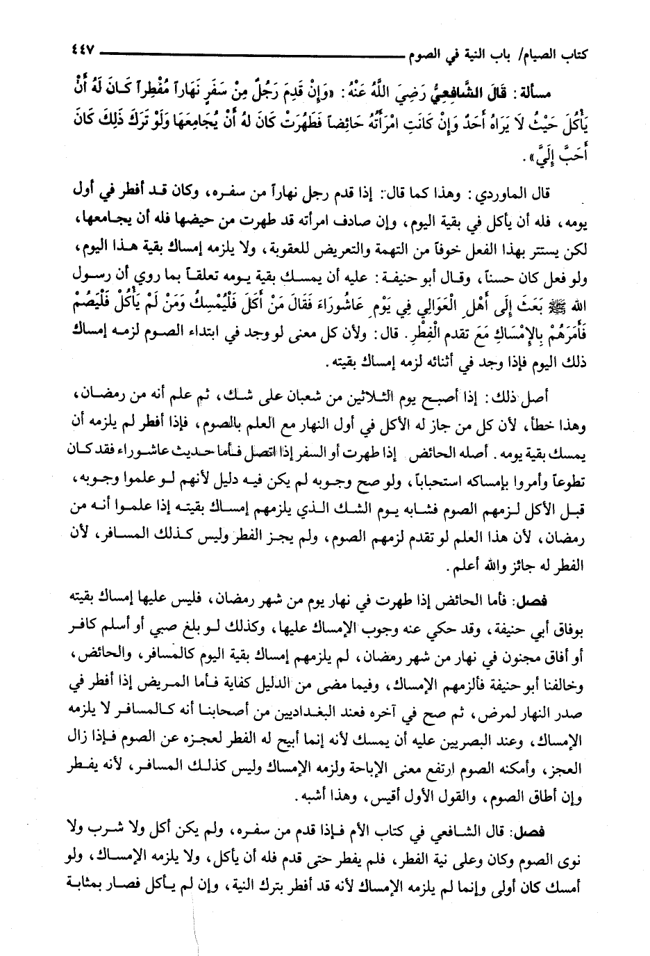 قَالَ الْمَاوَرْدِيُّ: وَهَذَا كَمَا قَالَ: إِذَا قَدِمَ رَجُلٌ نَهَارًا مِنْ سَفَرِهِ، وَكَانَ قَدْ أَفْطَرَ فِي أَوَّلِ يَوْمِهِ، فَلَهُ أَنْ يَأْكُلَ فِي بَقِيَّةِ الْيَوْمِ، وَإِنْ صَادَفَ امْرَأَتَهُ قَدْ طَهُرَتْ مِنْ حَيْضِهَا فَلَهُ أَنْ يُجَامِعَهَا، لَكِنْ يَسْتَتِرُ بِهَذَا الْفِعْلِ خَوْفًا مِنَ التُّهْمَةِ وَالتَّعْرِيضِ لِلْعُقُوبَةِ، وَلَا يَلْزَمُهُ إِمْسَاكٌ بَقِيَّةَ هَذَا الْيَوْمِ، وَلَوْ فَعَلَ كَانَ حَسَنًا، وَقَالَ أبو حنيفة: عَلَيْهِ أَنْ يُمْسِكَ بَقِيَّةَ يَوْمِهِ تَعَلُّقًا بِمَا رُوِيَ أَنَّ رَسُولَ اللَّهِ - صَلَّى اللَّهُ عَلَيْهِ وَسَلَّم َ - بَعَثَ إِلَى أَهْلِ الْعَوَالِي فِي يَوْمِ عَاشُورَاءَ فَقَالَ مَنْ أَكَلَ فَلْيُمْسِكْ وَمَنْ لَمْ يَأْكُلْ فَلْيَصُمْ فَأَمَرَهُمْ بِالْإِمْسَاكِ مَعَ تَقَدُّمِ الْفِطْرِ. قَالَ وَلِأَنَّ كُلَّ مَعْنًى لَوْ وُجِدَ فِي ابْتِدَاءِ الصَّوْمِ لَزِمَهُ إِمْسَاكُ ذَلِكَ الْيَوْمِ فَإِذَا وُجِدَ فِي أَثْنَائِهِ لَزِمَهُ إِمْسَاكُ بَقِيَّتِهِ.