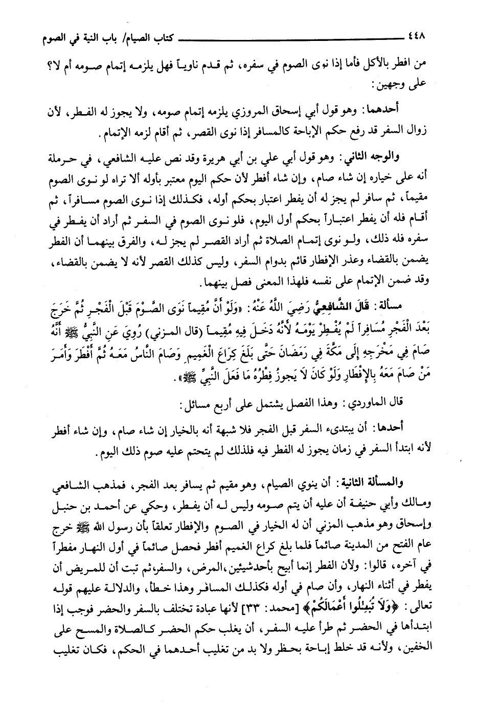 وَالْمَسْأَلَةُ الثَّانِيَةُ: أَنْ يَنْوِيَ الصِّيَامَ، وَهُوَ مُقِيمٌ ثُمَّ يُسَافِرَ بَعْدَ الْفَجْرِ، فَمَذْهَبُ الشَّافِعِيِّ وَمَالِكٍ وأبي حنيفة أَنَّ عَلَيْهِ أَنْ يُتِمَّ صَوْمَهُ وَلَيْسَ لَهُ أَنْ يُفْطِرَ، وَحُكِيَ عَنْ أَحْمَدَ بْنِ حَنْبَلٍ وَإِسْحَاقَ وَهُوَ مَذْهَبُ الْمُزَنِيِّ أَنَّ لَهُ الْخِيَارَ فِي الصَّوْمِ وَالْإِفْطَارِ تَعَلُّقًا بِأَنَّ رَسُولَ اللَّهِ - صَلَّى اللَّهُ عَلَيْهِ وَسَلَّم َ - خَرَجَ عَامَ الْفَتْحِ مِنَ الْمَدِينَةِ صَائِمًا فَلَمَّا بَلَغَ كُرَاعَ الْغَمِيمِ أَفْطَرَ فَحَصَلَ صَائِمًا فِي أَوَّلِ النَّهَارِ مُفْطِرًا فِي آخِرِهِ، قَالُوا: وَلِأَنَّ الْفِطْرَ إِنَّمَا أُبِيحَ بِأَحَدِ شَيْئَيْنِ، الْمَرَضُ، وَالسَّفَرُ، ثم تبت أَنَّ لِلْمَرِيضِ أَنْ يُفْطِرَ فِي أَثْنَاءِ النَّهَارِ، وأن صَامَ فِي أَوَّلِهِ فَكَذَلِكَ الْمُسَافِرُ وَهَذَا خَطَأٌ، وَالدَّلَالَةُ عَلَيْهِمْ قَوْله تَعَالَى: {وَلاَ تُبْطِلُواْ أعْمَالَكُمْ) {محمد: 33) لِأَنَّهَا عِبَادَةٌ تَخْتَلِفُ بِالسَّفَرِ وَالْحَضَرِ فَوَجَبَ إِذَا ابْتَدَأَهَا فِي الْحَضَرِ ثُمَّ طَرَأَ عَلَيْهِ السَّفَرُ، أَنْ يَغْلِبَ حُكْمُ الْحَضَرِ كَالصَّلَاةِ وَالْمَسْحِ عَلَى الْخُفَّيْنِ، وَلِأَنَّهُ قَدْ خَلَطَ إِبَاحَةً بِحَظْرٍ وَلَا بُدَّ مِنْ تَغْلِيبِ أَحَدِهِمَا فِي الْحُكْمِ، فكان تغليب