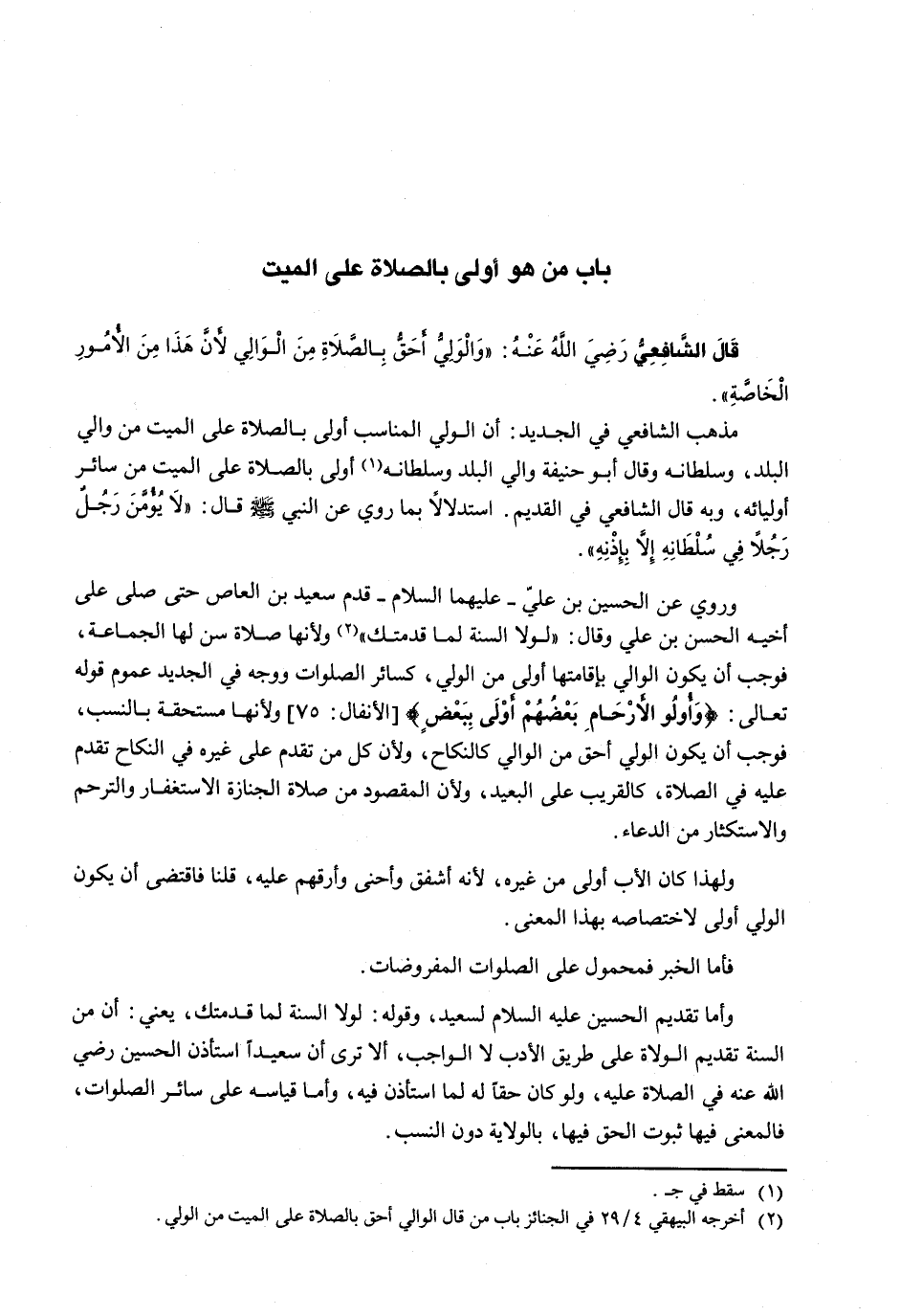 وأما تقديم الحسين عَلَيْهِ السَّلَامُ لِسَعِيدٍ، وَقَوْلُهُ: لَوْلَا السُّنَّةُ لَمَا قَدَّمْتُكَ، يَعْنِي: أنَّ مِنَ السُّنَّةِ تَقْدِيمَ الْوُلَاةِ عَلَى طَرِيقِ الْأَدَبِ لَا الْوَاجِبُ، أَلَا تَرَى أَنَّ سَعِيدًا اسْتَأْذَنَ الْحُسَيْنَ رَضِيَ اللَّهُ عَنْهُ فِي الصَّلَاةِ عَلَيْهِ، وَلَوْ كَانَ حَقًّا لَهُ لَمَا اسْتَأْذَنَ فِيهِ، وَأَمَّا قِيَاسُهُ عَلَى سَائِرِ الصَّلَوَاتِ، فَالْمَعْنَى فِيهَا ثُبُوتُ الْحَقِّ فِيهَا، بِالْوِلَايَةِ دون النسب.