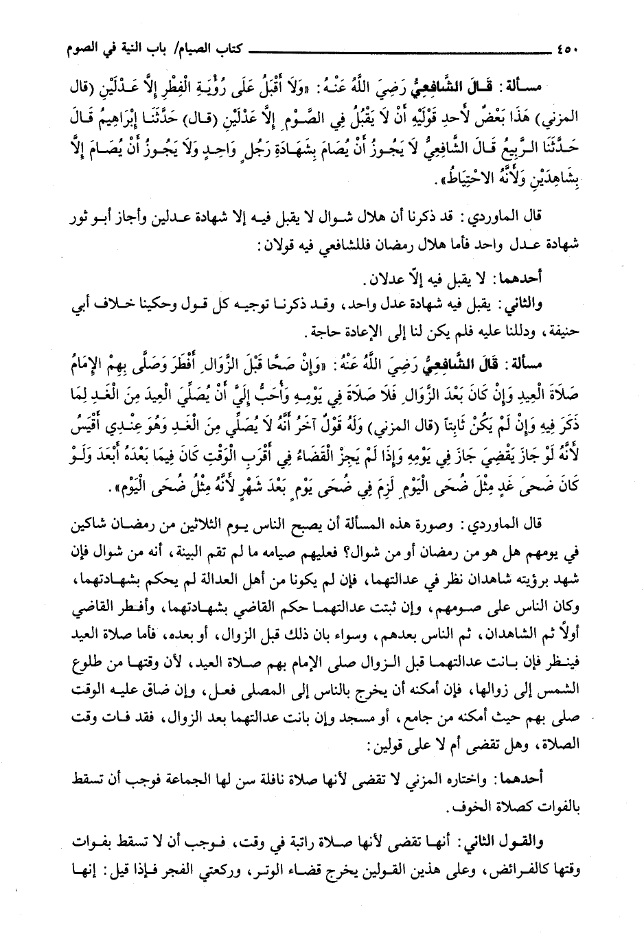 قَالَ الْمَاوَرْدِيُّ: وَصُورَةُ هَذِهِ الْمَسْأَلَةِ أَنْ يُصْبِحَ النَّاسُ يَوْمَ الثَّلَاثِينَ مِنْ رَمَضَانَ شَاكِّينَ فِي يَوْمِهِمْ هَلْ هُوَ مِنْ رَمَضَانَ أَوْ مِنْ شَوَّالٍ؟ فَعَلَيْهِمْ صِيَامُهُ مَا لَمْ تَقُمِ الْبَيِّنَةُ، أَنَّهُ مِنْ شَوَّالٍ فَإِنْ شَهِدَ بِرُؤْيَتِهِ شَاهِدَانِ نُظِرَ فِي عَدَالَتِهِمَا، فَإِنْ لَمْ يَكُونَا مِنْ أَهْلِ الْعَدَالَةِ لَمْ يُحْكَمْ بِشَهَادَتِهِمَا، وَكَانَ النَّاسُ عَلَى صَوْمِهِمْ، وَإِنْ ثَبَتَتْ عَدَالَتُهُمَا حَكَمَ الْقَاضِي بِشَهَادَتِهِمَا، وَأَفْطَرَ الْقَاضِي أَوَّلًا ثُمَّ الشَّاهِدَانِ، ثُمَّ النَّاسُ بَعْدَهُمْ، وَسَوَاءٌ بَانَ ذَلِكَ قَبْلَ الزَّوَالِ، أَوْ بَعْدَهُ، فَأَمَّا صَلَاةُ الْعِيدِ فَيُنْظَرُ فَإِنْ بَانَتْ عَدَالَتُهُمَا قَبْلَ الزَّوَالِ صَلَّى الْإِمَامُ بِهِمْ صَلَاةَ الْعِيدِ، لِأَنَّ وَقْتَهَا مِنْ طُلُوعِ الشَّمْسِ إِلَى زَوَالِهَا، فَإِنْ أَمْكَنَهُ أَنْ يَخْرُجَ بِالنَّاسِ إِلَى الْمُصَلَّى فَعَلَ، وَإِنْ ضَاقَ عَلَيْهِ الْوَقْتُ صَلَّى بِهِمْ حَيْثُ أَمْكَنَهُ مِنْ جَامِعٍ، أَوْ مَسْجِدٍ وَإِنْ بَانَتْ عَدَالَتُهُمَا بَعْدَ الزَّوَالِ، فَقَدْ فَاتَ وَقْتُ الصَّلَاةِ، وَهَلْ تُقْضَى أَمْ لَا عَلَى قَوْلَيْنِ: