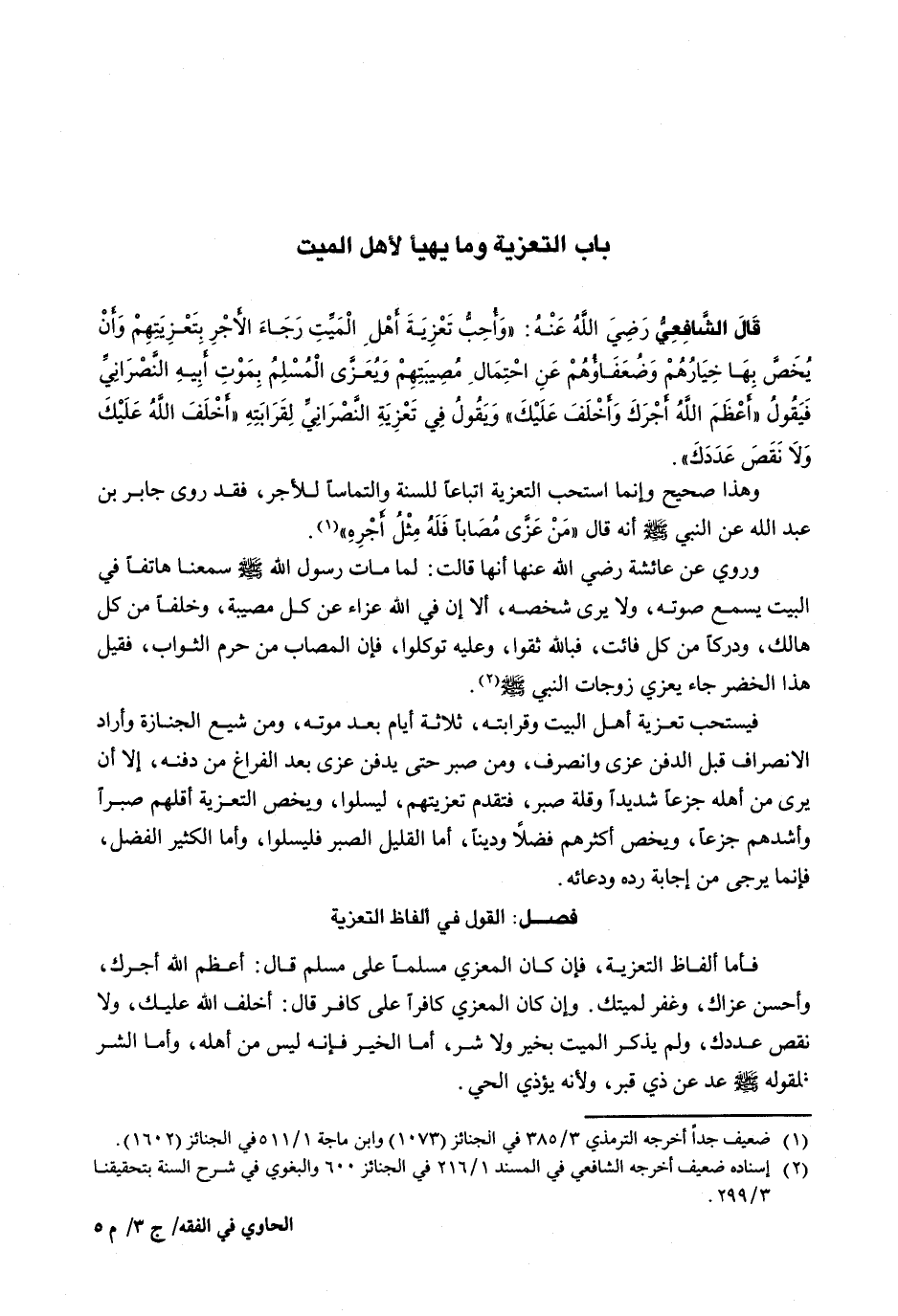 قال الشافعي رضي الله عنه: " وَأُحِبُّ تَعْزِيَةَ أَهْلِ الْمَيِّتِ رَجَاءَ الْأَجْرِ بِتَعْزِيَتِهِمْ وَأَنْ يُخَصَّ بِهَا خِيَارُهُمْ وَضُعَفَاؤُهُمْ عَنِ احْتِمَالِ مصيبتهم ويعزى المسلم بموت أبيه النصراني فيقول " أعظم الله أجرك وأخلف عليك " ويقول في تعزية النصراني لقرابته " أخلف الله عليك ولا نقص عددك ".