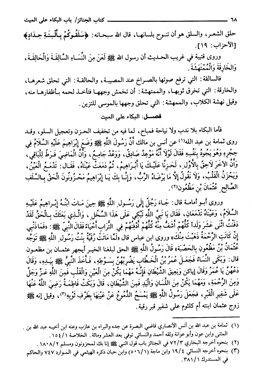 فَأَمَّا الْبُكَاءُ بِلَا نَدْبٍ وَلَا نِيَاحَةٍ فَمُبَاحٌ، لِمَا فِيهِ مِنْ تَخْفِيفِ الْحُزْنِ وَتَعْجِيلِ السُّلُوِّ، وَقَدْ رَوَى ثُمَامَةُ بْنُ عَبْدِ اللَّهِ عَنْ أَنَسِ بْنِ مَالِكٍ أَنَّ رَسُولَ اللَّهِ - صَلَّى اللَّهُ عَلَيْهِ وَسَلَّم َ - وَضَعَ إِبْرَاهِيمَ عَلَيْهِ السَّلَامُ فِي حِجْرِهِ وَهُوَ يَجُودُ بِنَفْسِهِ فَقَالَ لَوْلَا أَنَّهُ مَوْعِدٌ صادقٌ، ووعدٌ جامعٌ، وَأَنَّ الْمَاضِيَ فَرَطٌ لِلْبَاقِي، وَأَنَّ الْآخِرَ لاحقٌ بِالْأَوَّلِ، لَحَزِنَّا عَلَيْكَ يَا إِبْرَاهِيمُ، ثُمَّ دَمَعَتْ عَيْنَاهُ، فَقَالَ: تَدْمَعُ الْعَيْنُ، وَيَحْزَنُ الْقَلْبُ، وَلَا نَقُولُ إِلَّا مَا يَرْضَاهُ الرَّبُّ، وَإِنَّا بِكَ يَا إِبْرَاهِيمُ مَحْزُونُونَ الْحَقْ بِالسَّلَفِ الصَّالِحِ عُثْمَانَ بْنِ مَظْعُونٍ.