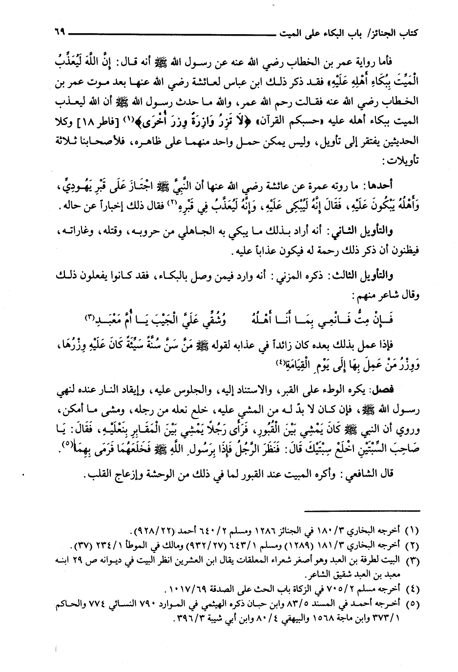 : يُكْرَهُ الْوَطْءُ عَلَى الْقَبْرِ، وَالِاسْتِنَادُ إِلَيْهِ، وَالْجُلُوسُ عَلَيْهِ، وَإِيقَادُ النَّارِ عِنْدَهُ لِنَهْيِ رَسُولِ اللَّهِ - صَلَّى اللَّهُ عَلَيْهِ وَسَلَّم َ -، فَإِنْ كَانَ لَا بُدَّ لَهُ مِنَ الْمَشْيِ عَلَيْهِ، خَلَعَ نَعْلَهُ مِنْ رِجْلِهِ، وَمَشَى مَا أَمْكَنَ، وَرُوِيَ أَنَّ النَّبِيَّ - صَلَّى اللَّهُ عَلَيْهِ وَسَلَّم َ - كَانَ يَمْشِي بَيْنَ الْقُبُورِ، فَرَأَى رَجُلًا يَمْشِي بَيْنَ الْمَقَابِرِ بِنَعْلَيْهِ، فَقَالَ: يَا صَاحِبَ السِّبْتَيْنِ اخْلَعْ سِبْتَيْكَ قَالَ: فَنَظَرَ الرَّجُلُ فَإِذَا بِرَسُولِ الله - صَلَّى اللَّهُ عَلَيْهِ وَسَلَّم َ - فخعلهما فَرَمَى بِهِمَا.
