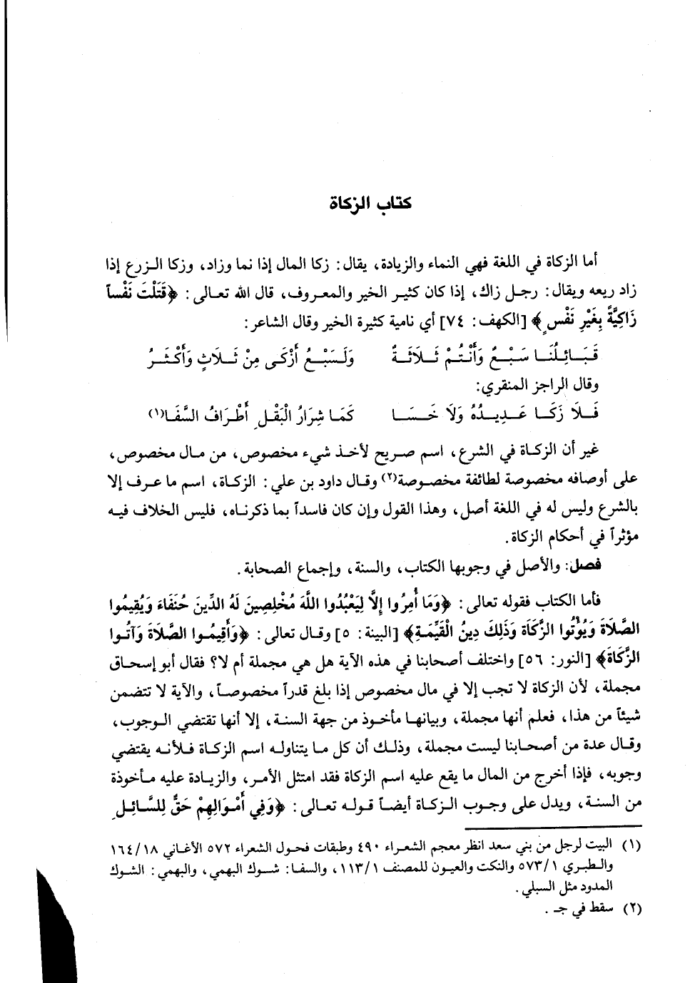 فَأَمَّا الْكِتَابُ فَقَوْلُهُ تَعَالَى: {وَمَا أُمِرُوا إلاَّ لِيَعْبُدُوا اللهَ مُخْلِصِينَ لَهُ الدِّينَ حُنَفَاءَ وَيُقِيمُوا الصَّلاّةَ وَيُؤْتُوا الزَّكَاةَ وَذَلِكَ دِينُ القَيِّمَةِ) {البينة: 5) وَقَالَ تَعَالَى: {وَأَقِيمُوا الصَّلاَةَ وَآتُوا الزَّكَاةَ) {النور: 56) وَاخْتَلَفَ أَصْحَابُنَا فِي هَذِهِ الْآيَةِ هَلْ هِيَ مُجْمَلَةٌ أم لا؟ فَقَالَ أَبُو إِسْحَاقَ مُجْمَلَةٌ، لِأَنَّ الزَّكَاةَ لَا تَجِبُ إِلَّا فِي مَالٍ مَخْصُوصٍ إِذَا بَلَغَ قَدْرًا مَخْصُوصًا، وَالْآيَةُ لَا تَتَضَمَّنُ شَيْئًا مِنْ هَذَا، فَعُلِمَ أَنَّهَا مُجْمَلَةٌ، وَبَيَانُهَا مَأْخُوذٌ مِنْ جِهَةِ السُّنَّةِ، إِلَّا أَنَّهَا تَقْتَضِي الْوُجُوبَ، وَقَالَ عدة مِنْ أَصْحَابِنَا لَيْسَتْ مُجْمَلَةً، وَذَلِكَ أَنَّ كُلَّ ما يتناوله اسم الزكاة فلأنه يقتضي وُجُوبَهُ، فَإِذَا أَخْرَجَ مِنَ الْمَالِ مَا يَقَعُ عَلَيْهِ اسْمُ الزَّكَاةِ فَقَدِ امْتَثَلَ الْأَمْرَ، وَالزِّيَادَةُ عَلَيْهِ مَأْخُوذَةٌ مِنَ السُّنَّةِ، وَيَدُلُّ عَلَى وُجُوبِ الزَّكَاةِ أَيْضًا قَوْله تَعَالَى: {وَفِي أمْوَالِهِمْ حَقٌّ لِلسَّائِلِ