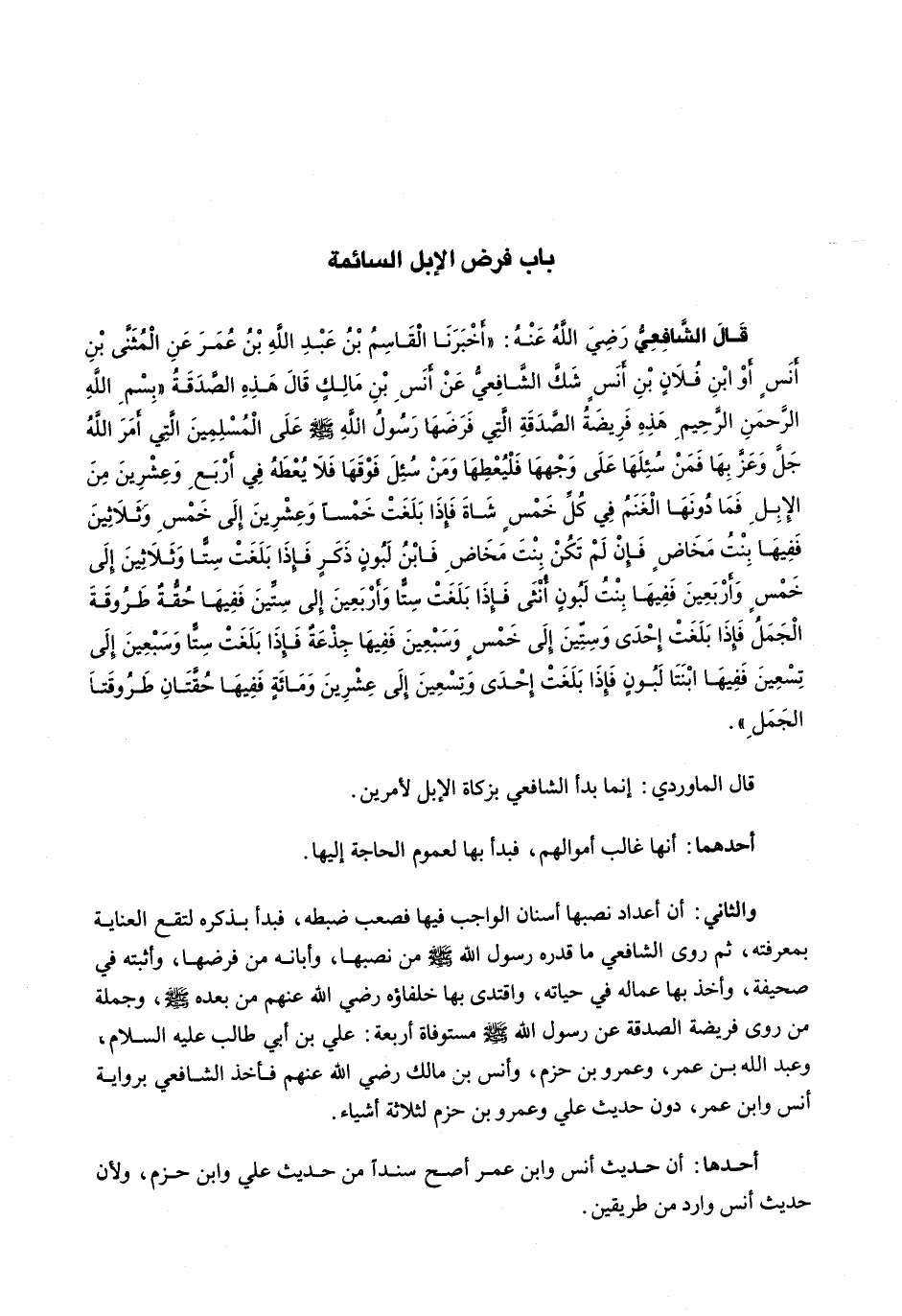 قال الشافعي رضي الله عنه: " أَخْبَرَنَا الْقَاسِمُ بْنُ عَبْدِ اللَّهِ بْنِ عُمَرَ عَنِ الْمُثَنَّى بْنِ أَنَسٍ أَوِ ابْنِ فُلَانِ بن أنس شك الشافعي عَنْ أَنَسِ بْنِ مَالِكٍ قَالَ هَذِهِ الصَّدَقَةُ " بِسْمِ اللَّهِ الرَّحْمَنِ الرَّحِيمِ هَذِهِ فَرِيضَةُ الصَّدَقَةِ الَّتِي فَرَضَهَا رَسُولُ اللَّهِ - صَلَّى اللَّهُ عَلَيْهِ وَسَلَّم َ - على المسلمين التي أمر الله جل وعز بها فَمَنْ سُئِلَهَا عَلَى وَجْهِهَا فَلْيُعْطِهَا وَمَنْ سُئِلَ فَوْقَهَا فَلَا يُعْطِهِ فِي أَرْبَعٍ وَعِشْرِينَ مِنَ الْإِبِلِ فَمَا دُونَهَا الْغَنَمُ فِي كُلِّ خَمْسٍ شَاةٌ فَإِذَا بَلَغَتْ خَمْسًا وَعِشْرِينَ إِلَى خَمْسٍ وثلاثين ففيها بنت مخاضٍ فإن لم تكن بنت مخاضِ فابن لبونٍ ذكر فإذا بلغت ستا وثلاثين إلى خمسٍ وأربعين ففيها بنت ليونٍ أنثى فإذا بلغت ستا وأربعين إلى ستين ففيها حقه طروقة الجمل فإذا بلغت إحدى وستين إلى خمس وسبعين ففيها جذعة فإذا بلغت ستا وسبعين إلى تسعين ففيها ابنتا لبون فإذا بلغت إحدى وتسعين إلى عشرين ومائةٍ ففيها حقتان طروقتا الجمل ". قَالَ الْمَاوَرْدِيُّ: إِنَّمَا بَدَأَ الشَّافِعِيُّ بِزَكَاةِ الْإِبِلِ لِأَمْرَيْنِ.