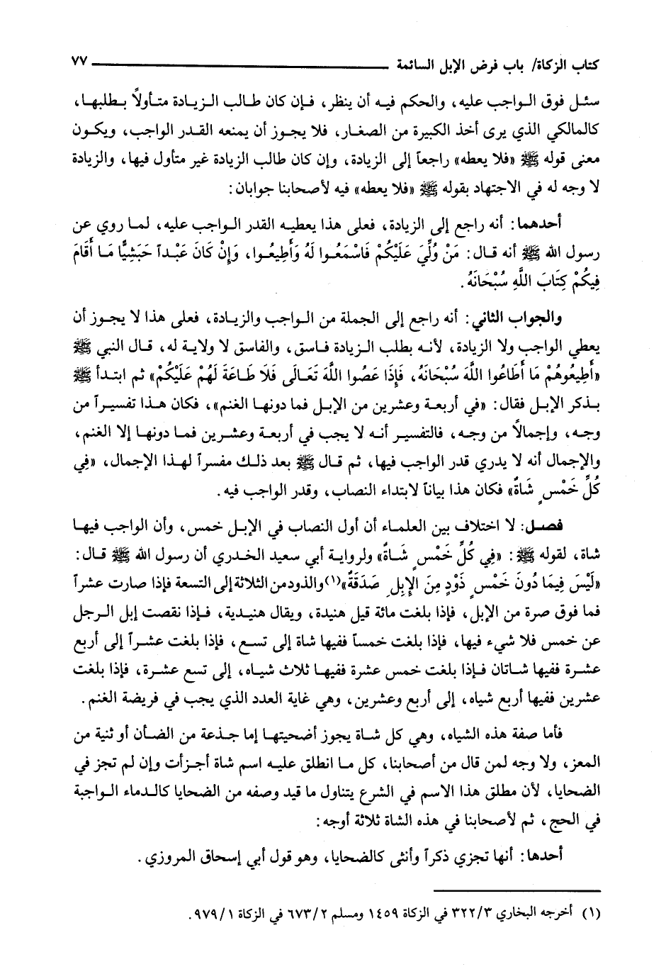 لَا اخْتِلَافَ بَيْنَ العلماء أن أول النصاب فِي الْإِبِلِ خَمْسٌ، وَأَنَّ الْوَاجِبَ فِيهَا شَاةٌ، لقوله - صَلَّى اللَّهُ عَلَيْهِ وَسَلَّم َ -: " فِي كُلِّ خمسٍ شاةٌ " وَلِرِوَايَةِ أَبِي سَعِيدٍ الْخُدْرِيِّ أَنَّ رَسُولَ اللَّهِ - صَلَّى اللَّهُ عَلَيْهِ وَسَلَّم َ - قال: " ليس فيما دون خمس ذودٍ من الإبل صدقة " والذوذ مِنَ الثَّلَاثَةِ إِلَى التِّسْعَةِ فَإِذَا صَارَتْ عَشْرًا فما فوق صرة من الإبل، فإذا بلغت مائة قيل هنيدة، وَيُقَالُ هُنَيْدِيَّةٌ، فَإِذَا نَقَصَتْ إِبِلُ الرَّجُلِ عَنْ خَمْسٍ فَلَا شَيْءَ فِيهَا، فَإِذَا بَلَغَتْ خَمْسًا فَفِيهَا شَاةٌ إِلَى تِسْعٍ، فَإِذَا بَلَغَتْ عَشْرًا إلى أربع عشرة ففيها شاتان فَإِذَا بَلَغَتْ خَمْسَ عَشْرَةَ فَفِيهَا ثَلَاثُ شِيَاهٍ، إِلَى تِسْعَ عَشْرَةَ، فَإِذَا بَلَغَتْ عِشْرِينَ فَفِيهَا أَرْبَعُ شِيَاهٍ، إِلَى أَرْبَعٍ وَعِشْرِينَ، وَهِيَ غَايَةُ الْعَدَدِ الَّذِي يَجِبُ فِي فَرِيضَةِ الْغَنَمِ.