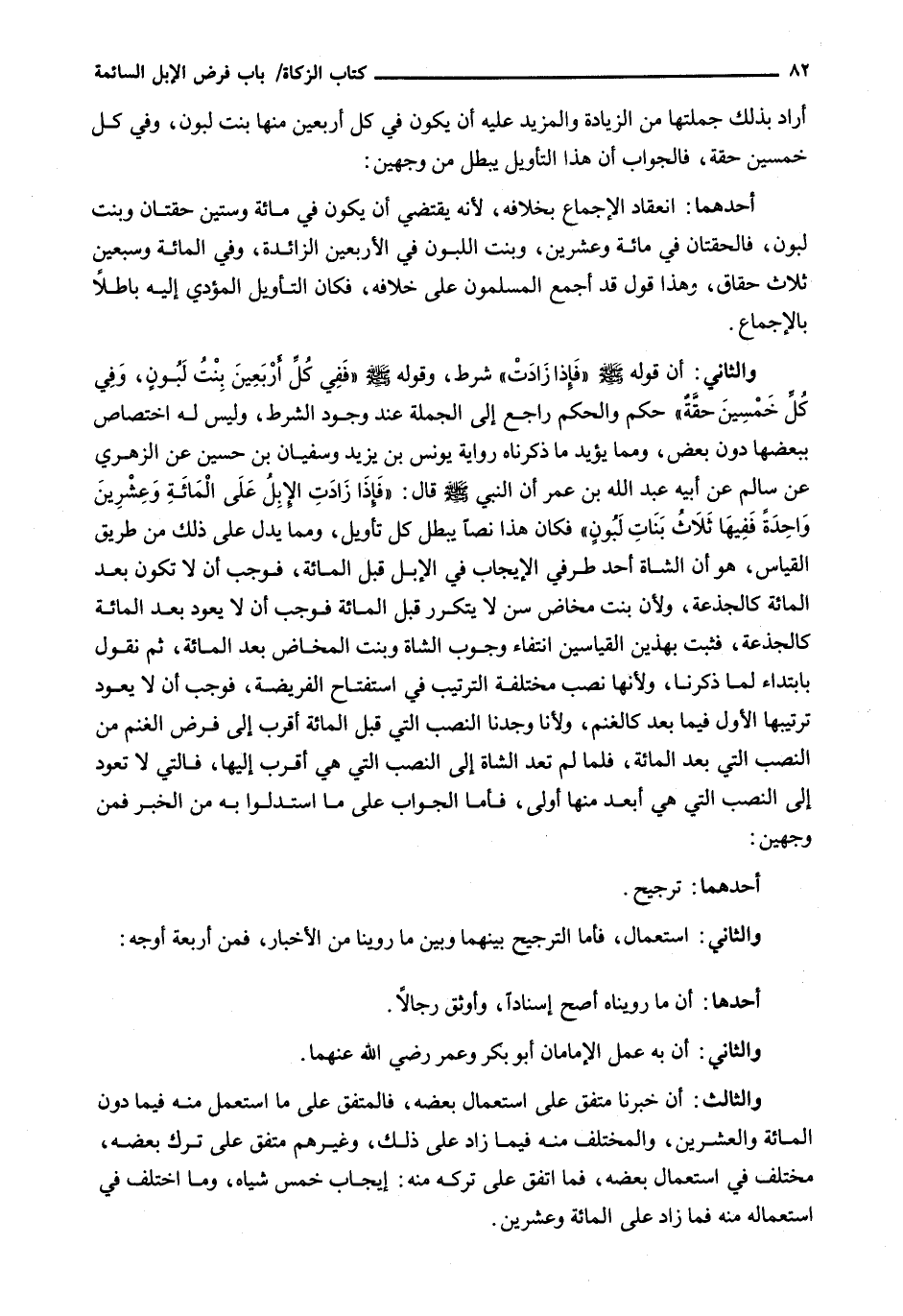 أَرَادَ بِذَلِكَ جُمْلَتَهَا مِنَ الزِّيَادَةِ وَالْمَزِيدُ عَلَيْهِ أَنْ يَكُونَ فِي كُلِّ أَرْبَعِينَ مِنْهَا بِنْتُ لَبُونٍ، وَفِي كُلِّ خَمْسِينَ حِقَّةٌ، فَالْجَوَابُ أَنَّ هَذَا التَّأْوِيلَ يَبْطُلُ مِنْ وَجْهَيْنِ: